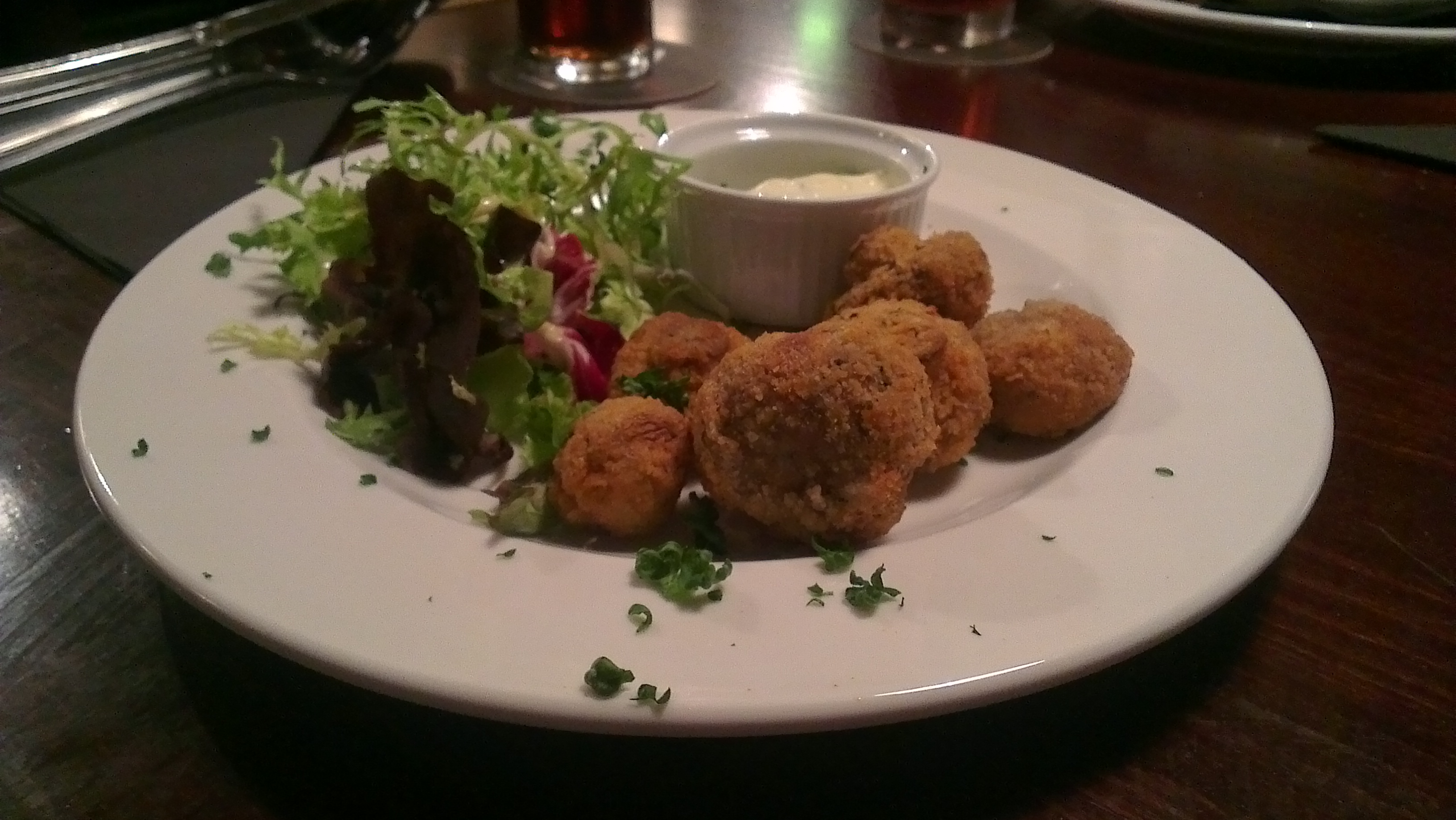 Having perused the menu, deciding of course on a steak, we only had a short wait for our appetisers to arrive. Between 4 we had a good cross section of the menu; I ate barbeque ribs which had good meat that slipped nicely off the bone. The glaze/sauce however didn’t have the inherent sweetness that should go along with the smoke of BBQ. A few breaded mushrooms we thought rather bland and meagre which was surprising as two starters of Pepperpot Mushrooms and Pizza Bread were vast and had bolder flavours. There was certainly no shortage of peppercorns in the mushroom dish but that did leave the more subtle mushrooms struggling to compete. Starters ranged between £3-5 .