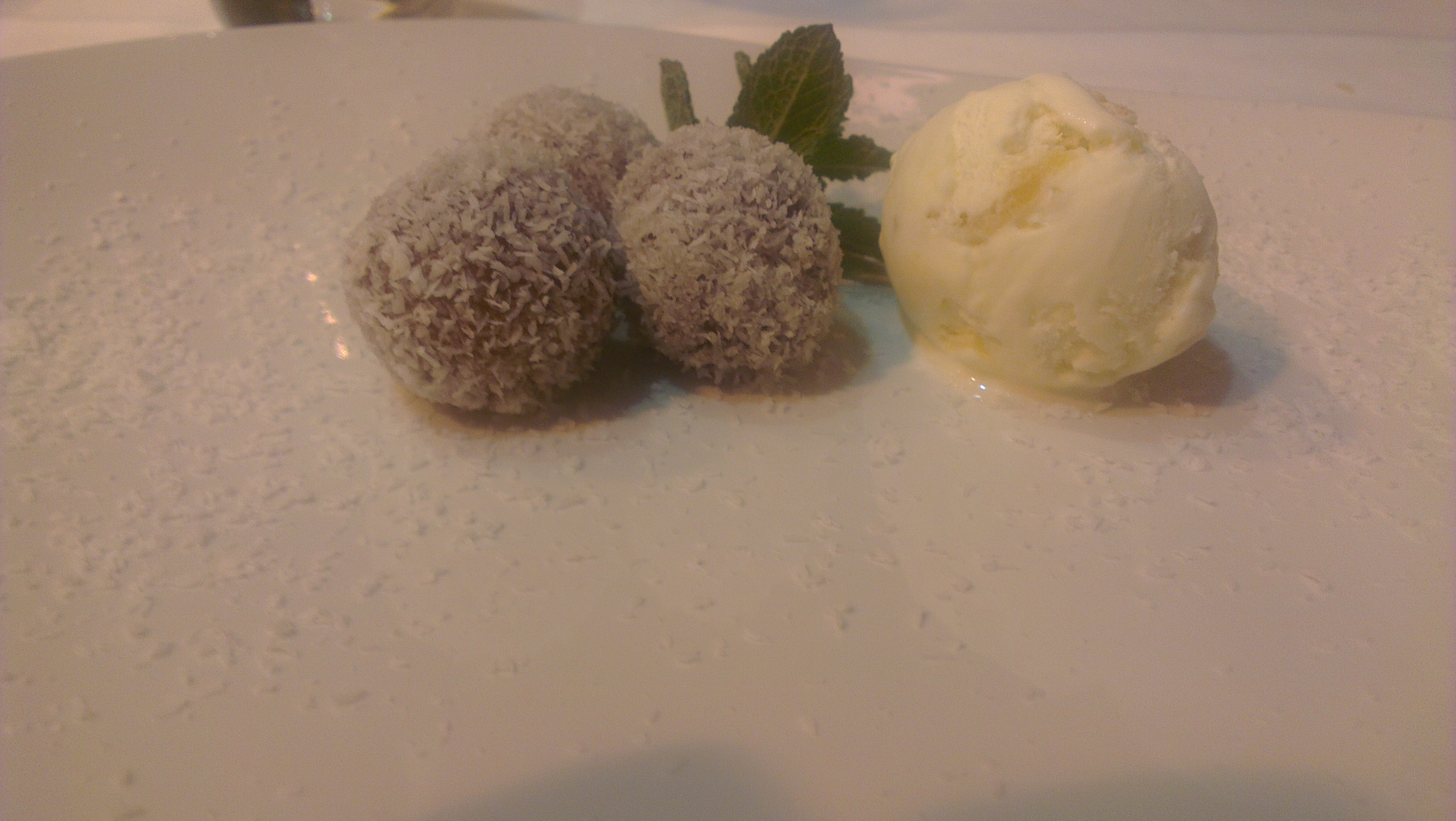 However they were mostly happy as they had chosen much better than I. A trio of chicken dishes were being enjoyed and I tried some of each, they must have taken pity on me. A saag was classic but well done, Suka-Masala Chooza was also good but it was Punjabi Karahi that stood out for me as a vibrant dish with lots of tomatoes and peppers giving a fresh note. A Peshwari naan was enjoyable, well cooked and the right balance of sweetness. I decided to order a dessert, partly to give a chance for redemption, partly as I was left unsatisfied. Gulab Jamun is a dumpling-like dessert which came prettily presented with Bellini ice-cream. The sticky sweet balls were well spiced with just the right level of cardamom although despite the ambition a vanilla ice-cream would have been a more successful pairing than the peach.