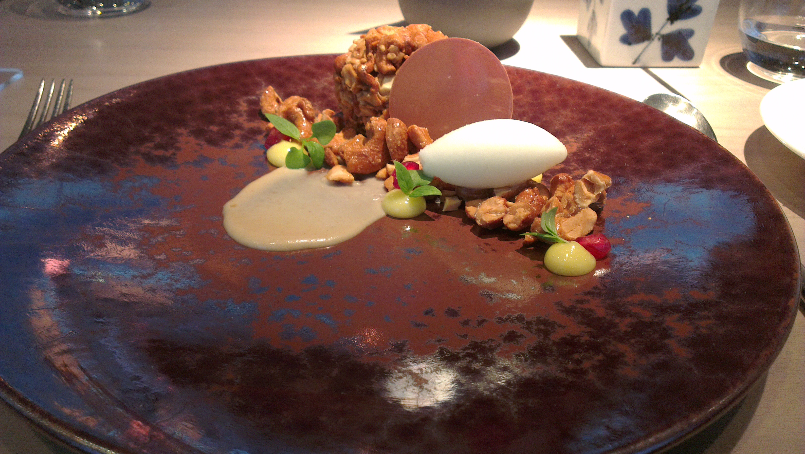 Amongst the office buildings between Old Street and Liverpool Street lies a building very much hiding its Michelin starred credentials within. HKK is owned by the Hakkasan group which includes Yauatcha, Sake no Hana, as well as a number of restaurants eponymously named. The look is simple and understated with clean lines dominating the counter service section as well as main dining room. There are number of tasting menus lunch or evening with an a la carte offering always present too. I had lunch with a friend who chose the 4 course seafood lunch menu; myself a meat version, both priced £28.50.