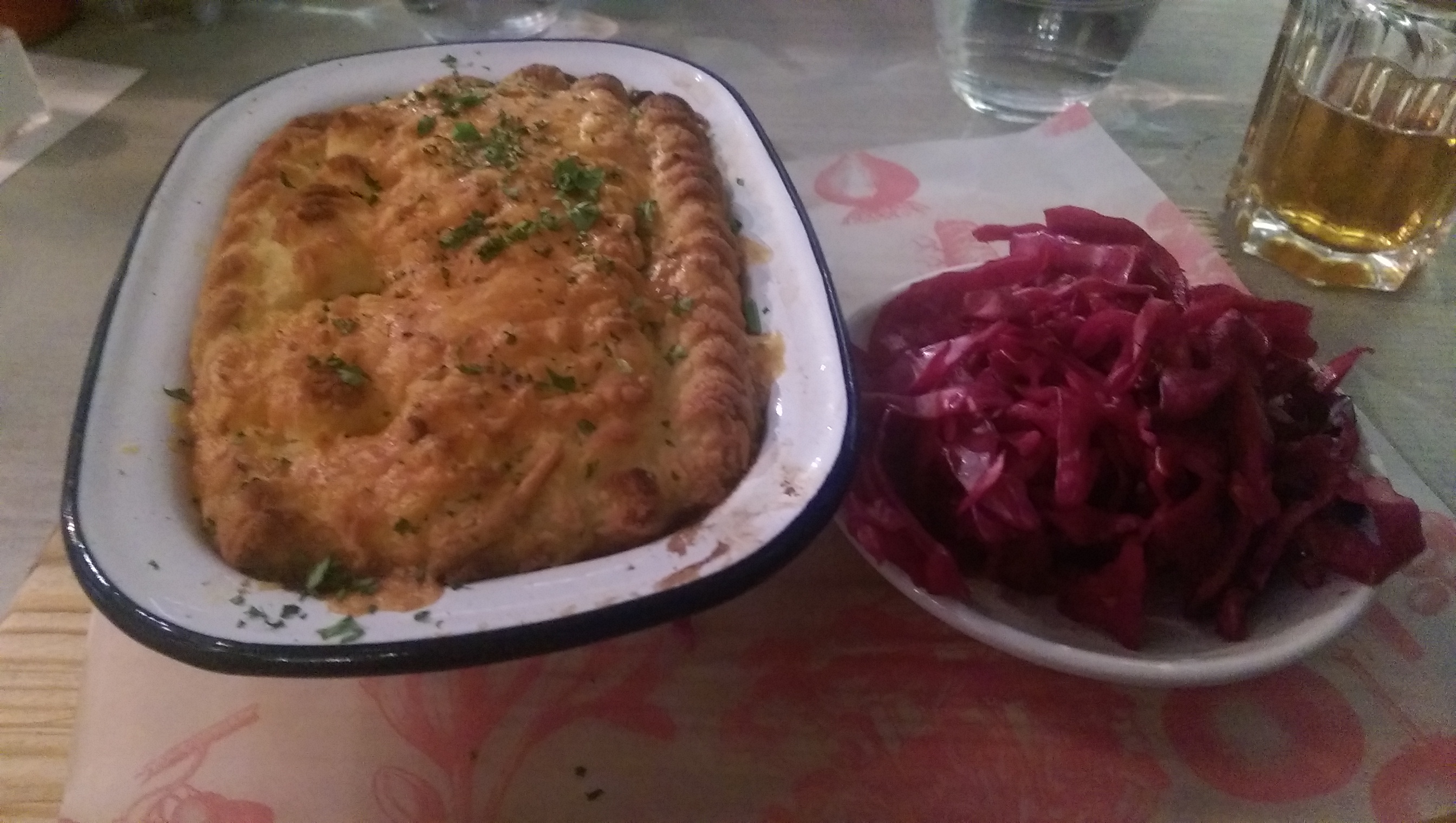 I had higher hopes for the main course. Burgers are £10 (inc. Fries) with steaks up to £18.50. I rallied against seasonal eating having chosen a hearty duck pie with red cabbage, £12. Things started well, the pie was topped with mash folded with smoked cheddar, as tasty a pie topping as I have ever had. What lay beneath was chunks of duck leg with a good gamey flavour as one would expect. Sadly that is as far as the success went. The menu had promised “rich gravy”, in reality the Sahara, open-lidded, duck pie would have delivered more moisture than Bill’s.