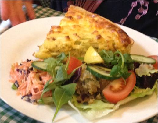 A blackboard provides the list of dishes for the day. There is always a soup, several flans and about five hot lunch dishes, all of which come with a small salad, all at £6.95. Salad here means the green stuff with three salads of the day. On our day that was a beetroot salad, a slaw and a wonderful lentil salad, which I can only describe as a warming squidge of hearty goodness. Children are catered for with smaller portions of the adult dishes, and you can always get chips and cheesy chips if you wish to show your brethren what a balanced diet looks like.