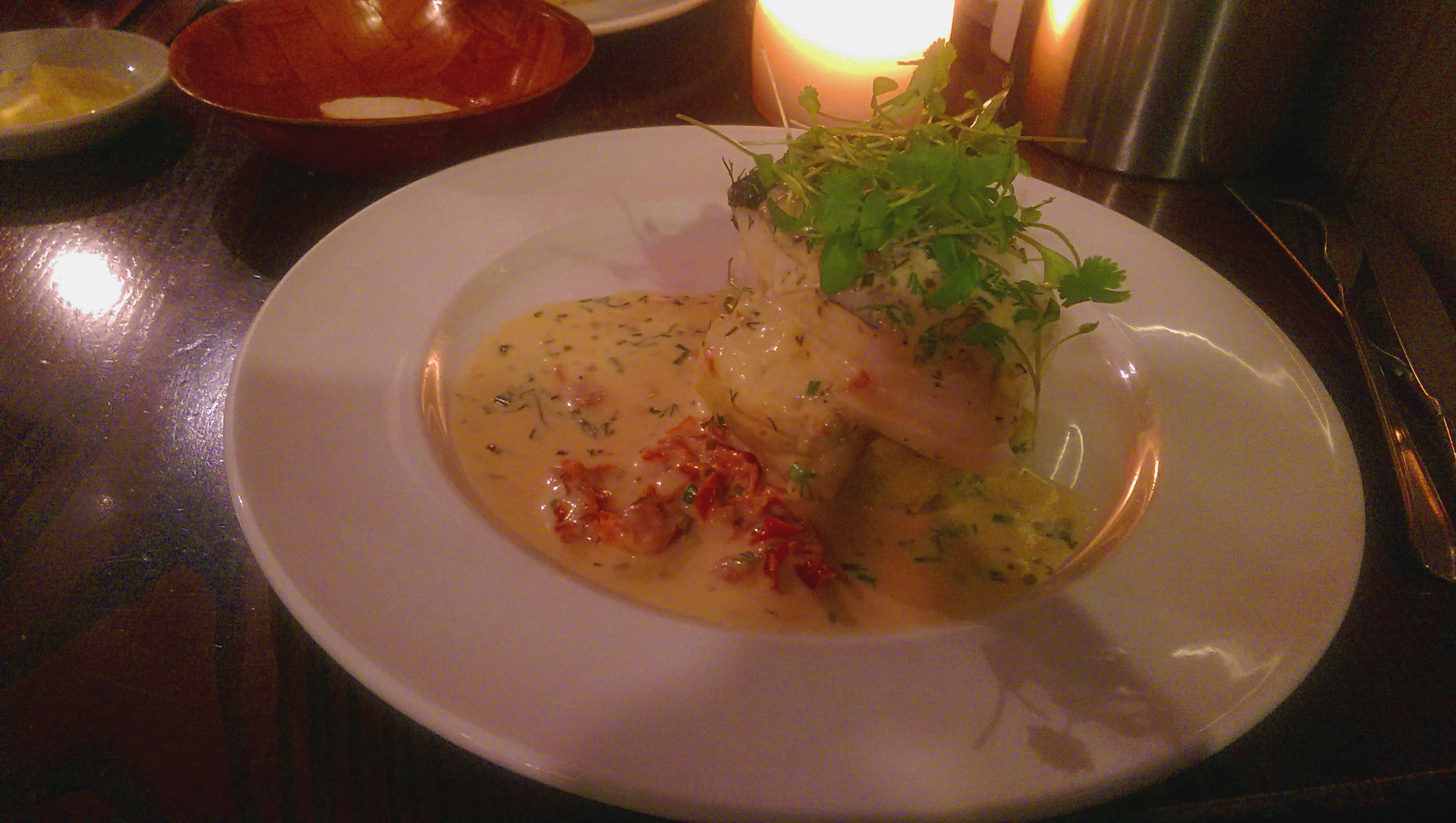 The main course was cod, chosen from the specials, wasn’t a particular looker. I’m not a fan of stacking food and white on white on white with some limp herb fronds didn’t sing to me. Happily it ate better than it looked. The fish was well cooked, delivering big pearly flakes of goodness. The sauce here had seen more liberal booze, and was all the better for it with the wine’s acidity working well with the fish and crushed potatoes.