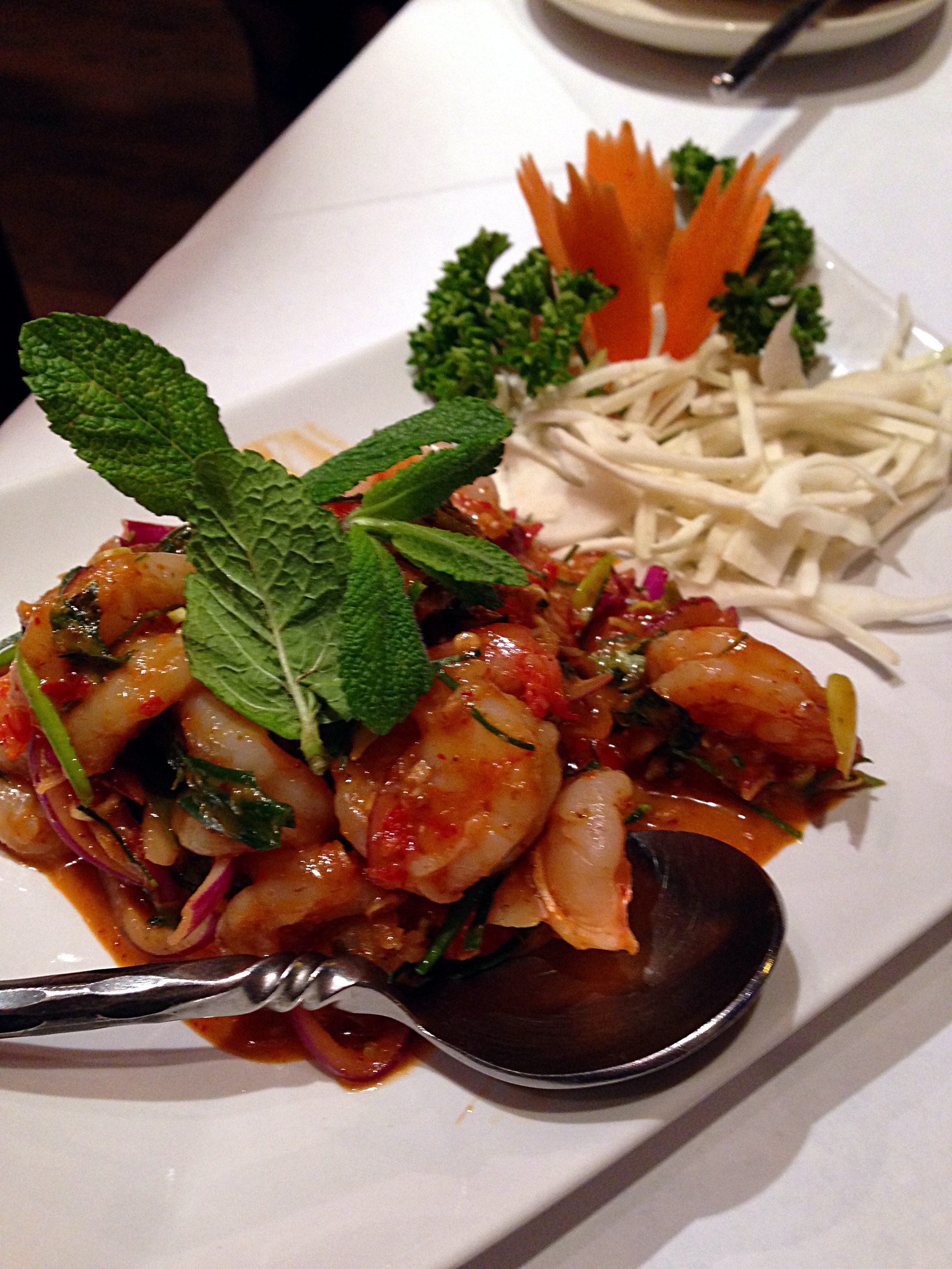 The husband plumped for Pla Goong (£8.95), a milder prawn dish that came amply piled with very happy, meaty, curly pink prawns. He was glad to have ordered some steamed rice (£2.00) to soothe his slightly less mental palate, although despite the heat he insisted on finishing off the dressing left on my pretty bare plate. His food was so good he forgot he had half a beer left. That is a ringing endorsement.