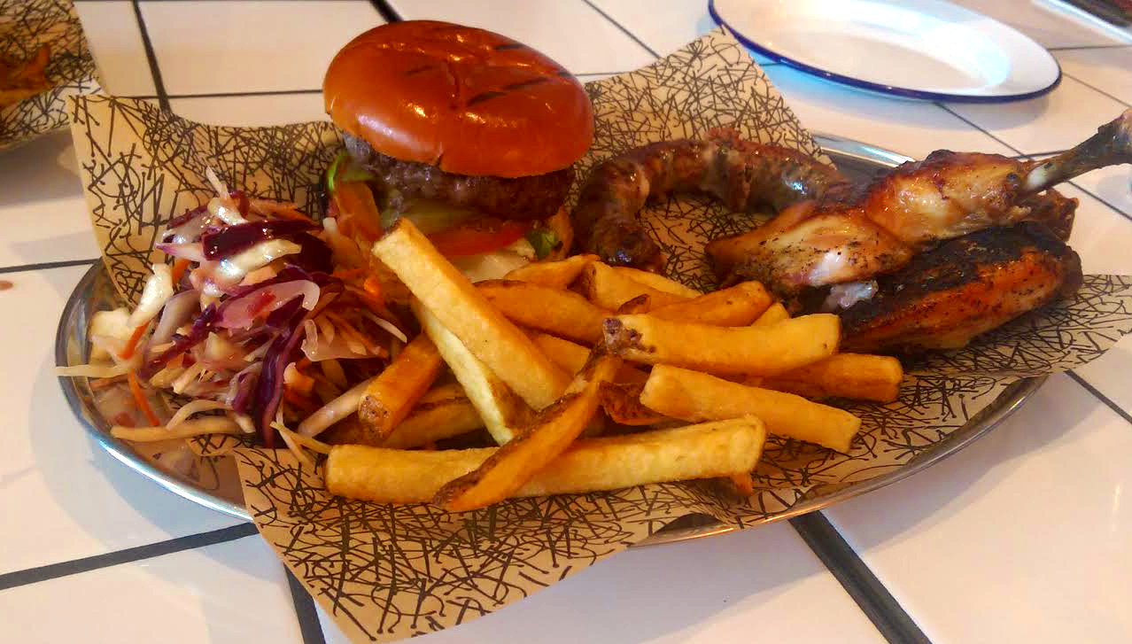 I’d thought Oaks had been open for a couple of weeks when I stopped by on a Tuesday night, as it transpired it was their second night following a period of soft launch. The name of the new restaurant is a reference to their cooking method with food cooked over wooden embers. I liked the dining space, a light, open-plan room with lots of wood as you would imagine. The drinks menu was jut the right size, though the only local nod I saw was Harvest Pale. The timing of our visit was particularly lucky as all customers in their first few days were treated to some extras. A bowl of crackling appeared and was one of the better examples I’ve had, very crispy and much lighter than most with a sprinkling of something spicy. At £2 I might like a bigger portion if I were to order them from the menu, but it was hard to tell if we’d been given a mini one as a freebie. The main menu is comprised, mainly, of sausages and burgers. A few other options; chicken, steak, halloumi and sea bass are available too. To get to try as much as possible we decided on a sharing platter. For £30 you get half a chicken, a sausage, a burger and 2 sides.
