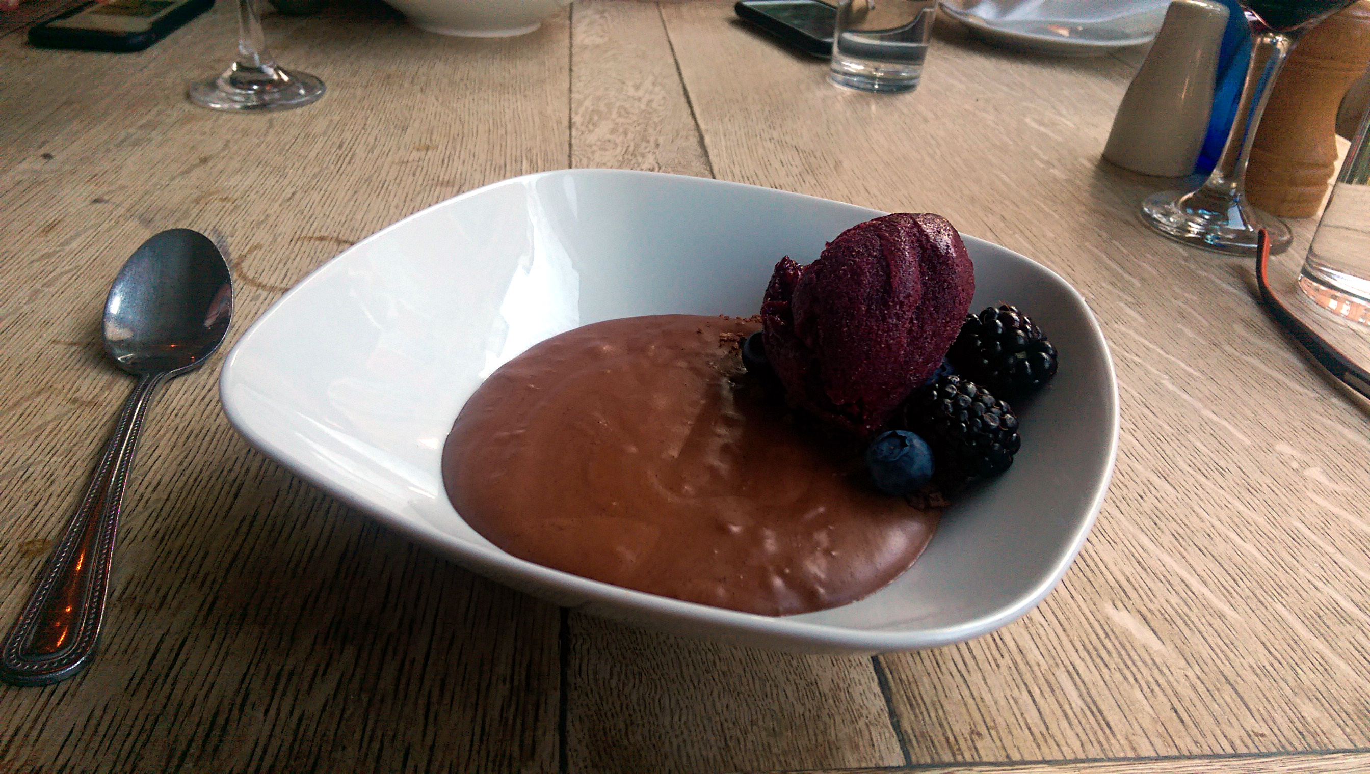 A chocolate mousse dessert look the fancy, I could have eaten most of the options though! Here presentation left a little to be desired. It looked like something I’d be pleased to serve at dinner party but hardly in a restaurant. The rich, silky, chocolate was certainly enjoyable and worked well with the few fruits and cherry sorbet. If I had to critique, and that’s sort of the point here, the technique for the sorbet was a little off as the texture was quite firm and grainy.