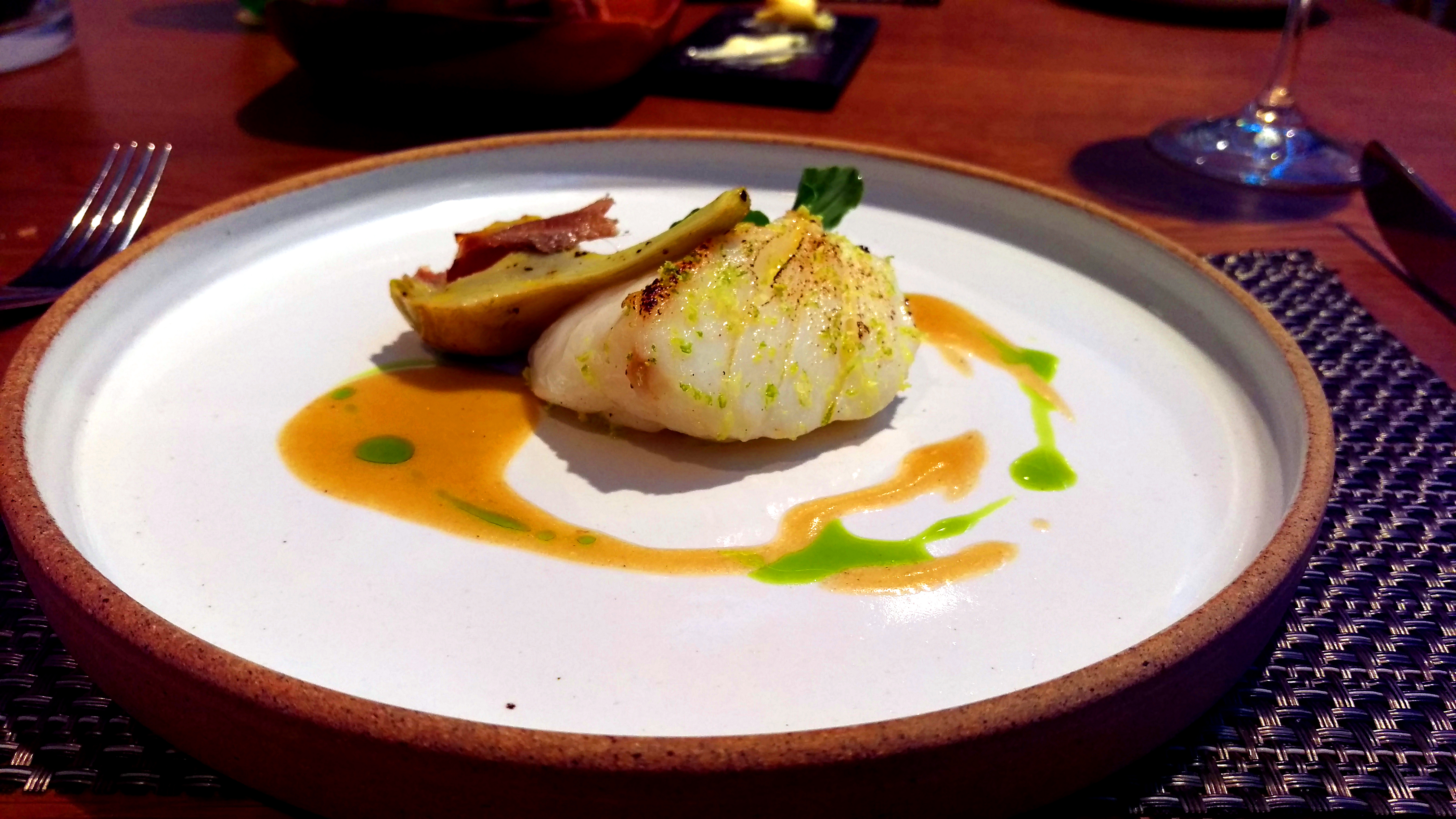 The dish of the meal arrived next, a modest cup of crab risotto that was beautiful sweet with the white crab meat and a few brown shrimps a more savoury note. F0llowing that was a minimalist affair with a plump fillet of cod, simply served with an artichoke. Again pretty on the plate but flavours here weren’t as prominent, a nice dish but lacking something, be it in texture or taste.