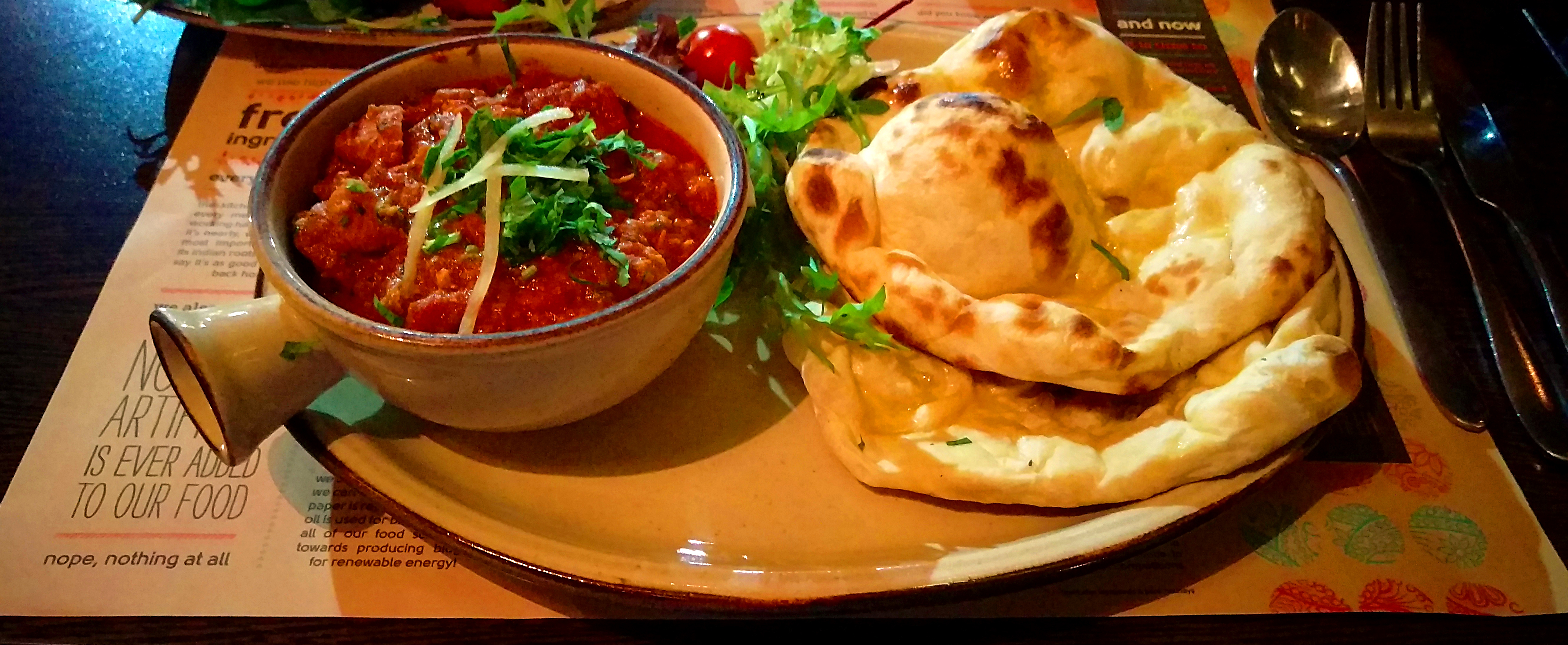 Tamatanga describes itself as an ‘Urban Indian Canteen’, it’s a restaurant that is in your face. What comes first to my mind is their bright, branding and imagery, a jazzy website and staff kitted out in t-shirts the company logo. Despite all of this they aren’t a chain, which may surprise you as much as it surprised me. Or everyone knew that and my food blogging reputation is in tatters, though I did corroborate my thoughts with work colleagues!  Tamatanga’s menu has plenty to choose from, classic curries are there as well salad bowls, wraps and thalis. It’s big but offers lots of choices to suit everyone. I will say that some of their positive terminology wears a bit thin for me. One section of the menu is headed “lovely curries” and proclaims that they “taste great”. I think their diners should be the judge of that.