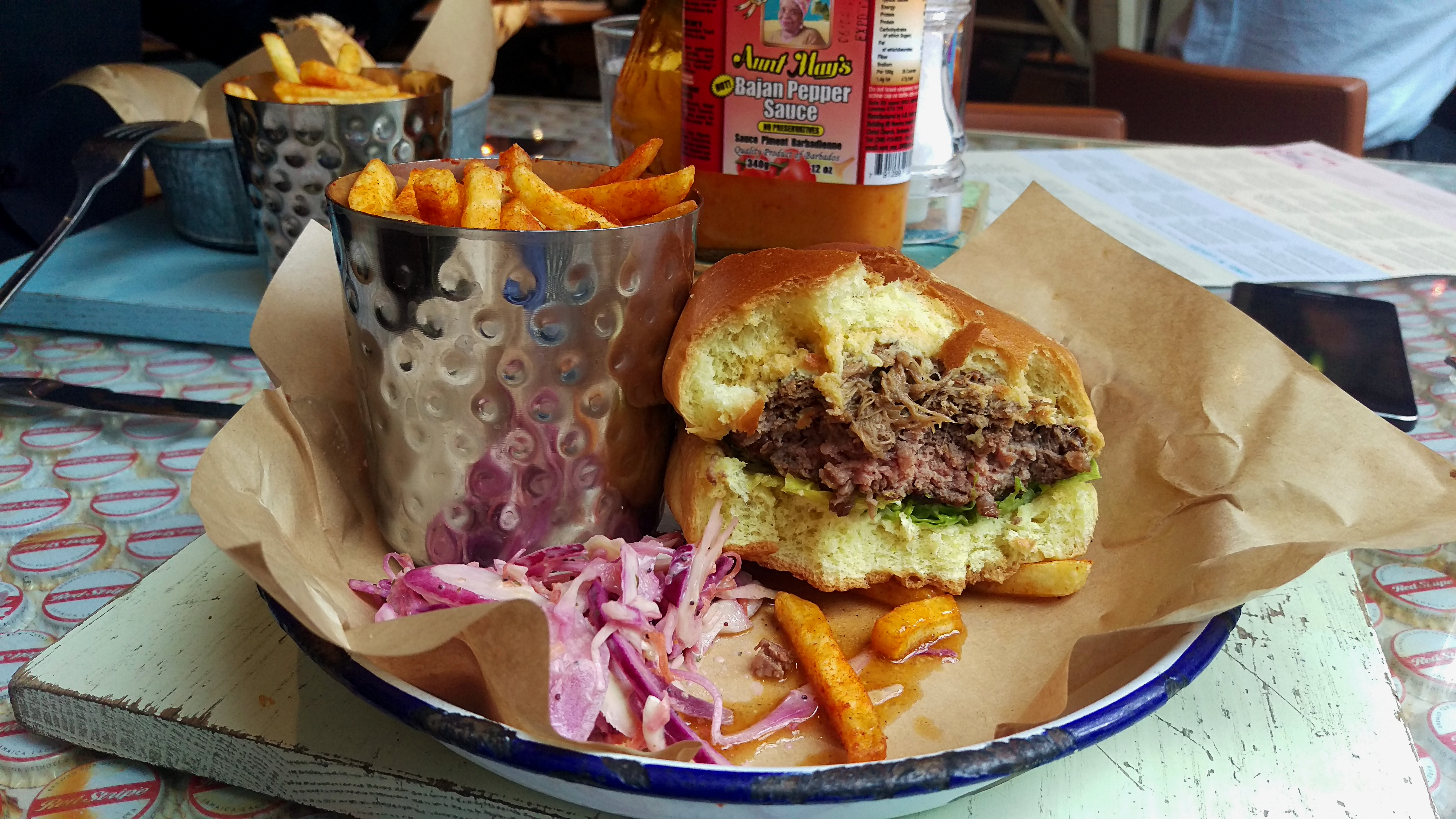 The menu has lots of things from the grill, mostly with jerk marinate as well as some Caribbean curries, the browned chicken my favourite of those. On this occasion I popped in for a quick lunch and went for a Street Burger from the “Lunch n Lighter” section. The jerk pulled pork that topped the meat was used sparingly but had a good warmth from the spices. The burger itself was equally enjoyable, well cooked, though a sweet brioche bun often divides opinion it worked well with the spice. It came with fries and slaw that were both contributing effectively to the meal, the slaw crunchy and fresh and not an afterthought like it often can be. One of the most enjoyable additions was Aunt May’s Bajan Sauce which was a firey yellow number that adorns every table. Having discovered you can now get it Tesco I am likely to invest in a bottle.