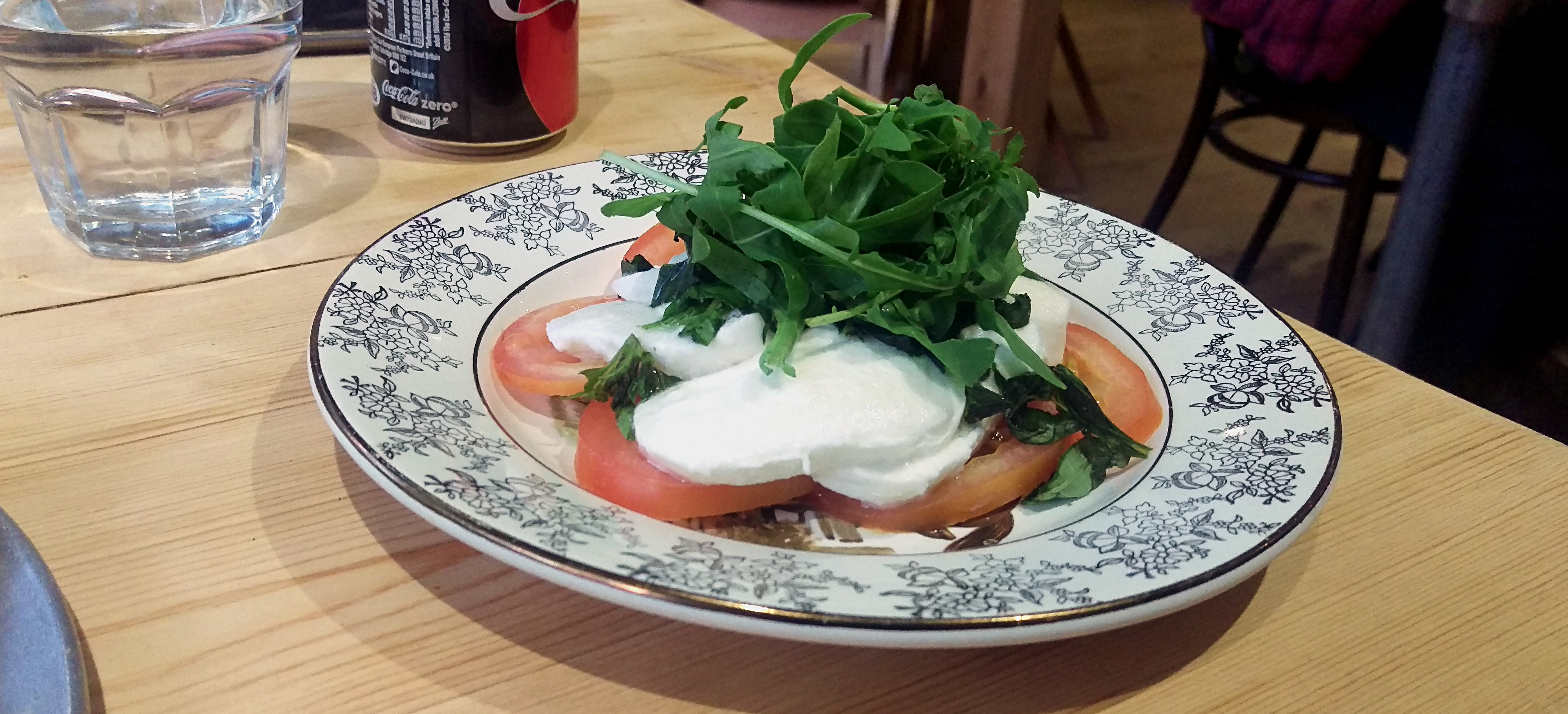 I chose a mushroom and truffle oil number (£9) and shared sides of paprika fries (£3) and a caprese (£5.50). Sadly they didn’t have any of the mushrooms for the pizza, they had other mushrooms but not the “right” mushrooms. As I am not a man to compromise on his funghi I asked the chef (open kitchen) creating the pizza’s what he recommended. After an uninspiring reply of “have what you want mate” was returned I made a snap decision to have The Green Machine. A little wait did ensue but a table of 6 ordered just before us and for a small place I can excuse this.