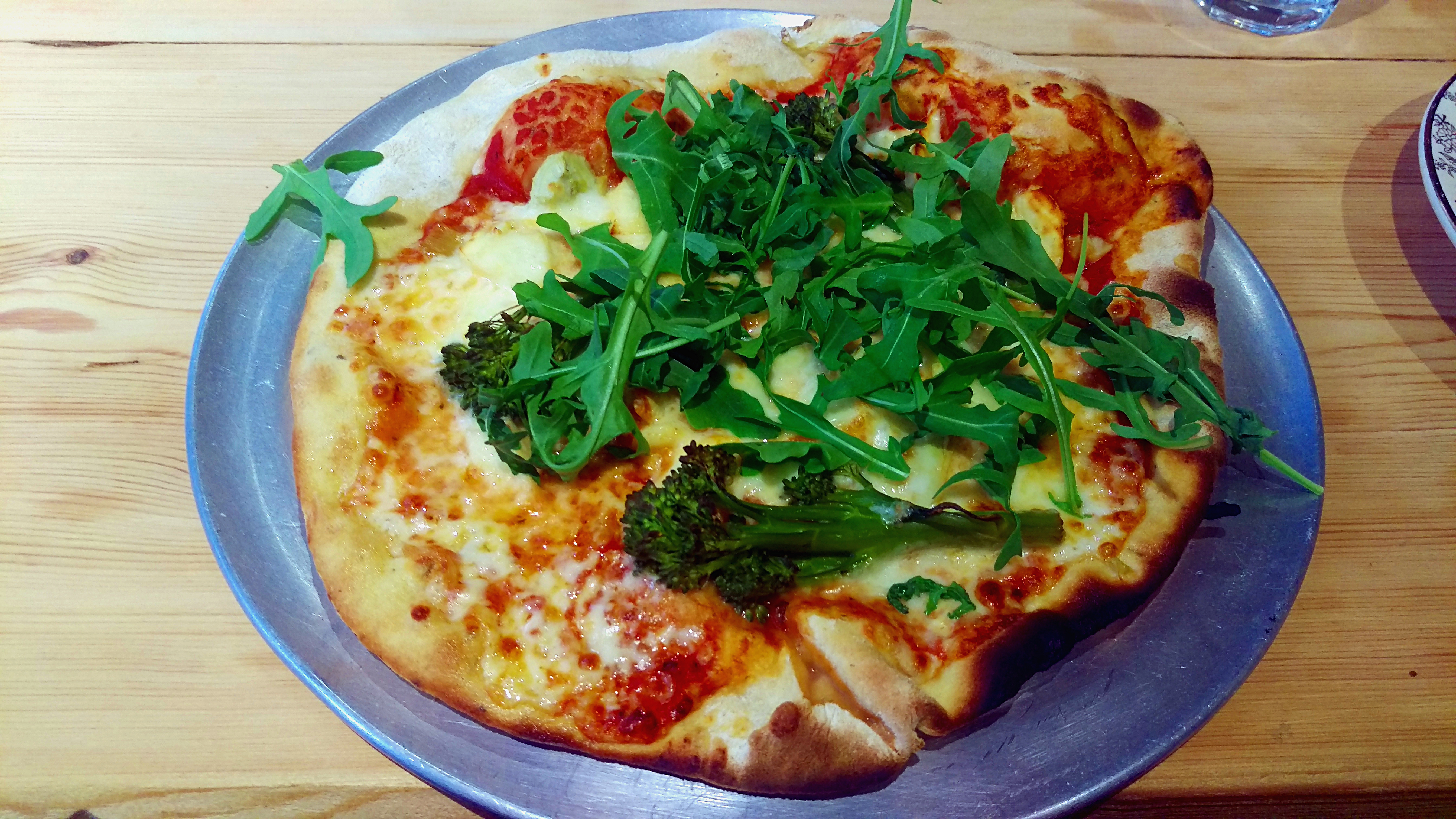 The first thought when it did arrive was that of disappointment at the mound of (unadvertised) rocket. To my mind it is unnecessary and hides the real beauty of the pizza underneath. Had they of asked if I wanted it I’d have declined but thought it was a nice free addition. My Green Machine was pretty nice overall, a decent base and sauce. The toppings I was a bit less convinced about. Halloumi, broccoli and artichoke were the main ones, apparently some basil too but I struggled to detect any. Halloumi as well as mozzarella is a bit weird, not bad but just fighting for your attention, mostly on texture. Artichoke was the most traditional element and turned out to be the best, the broccoli’s problem is that it’s unwieldy and an unusual texture for pizza. I tended to go for a bite and end up having to eat the whole stem at once, tricksy little buggers. My girlfriend’s goats cheese and caramelised red onion was on safer footing with its ingredients but did suffer from a thick base in parts.