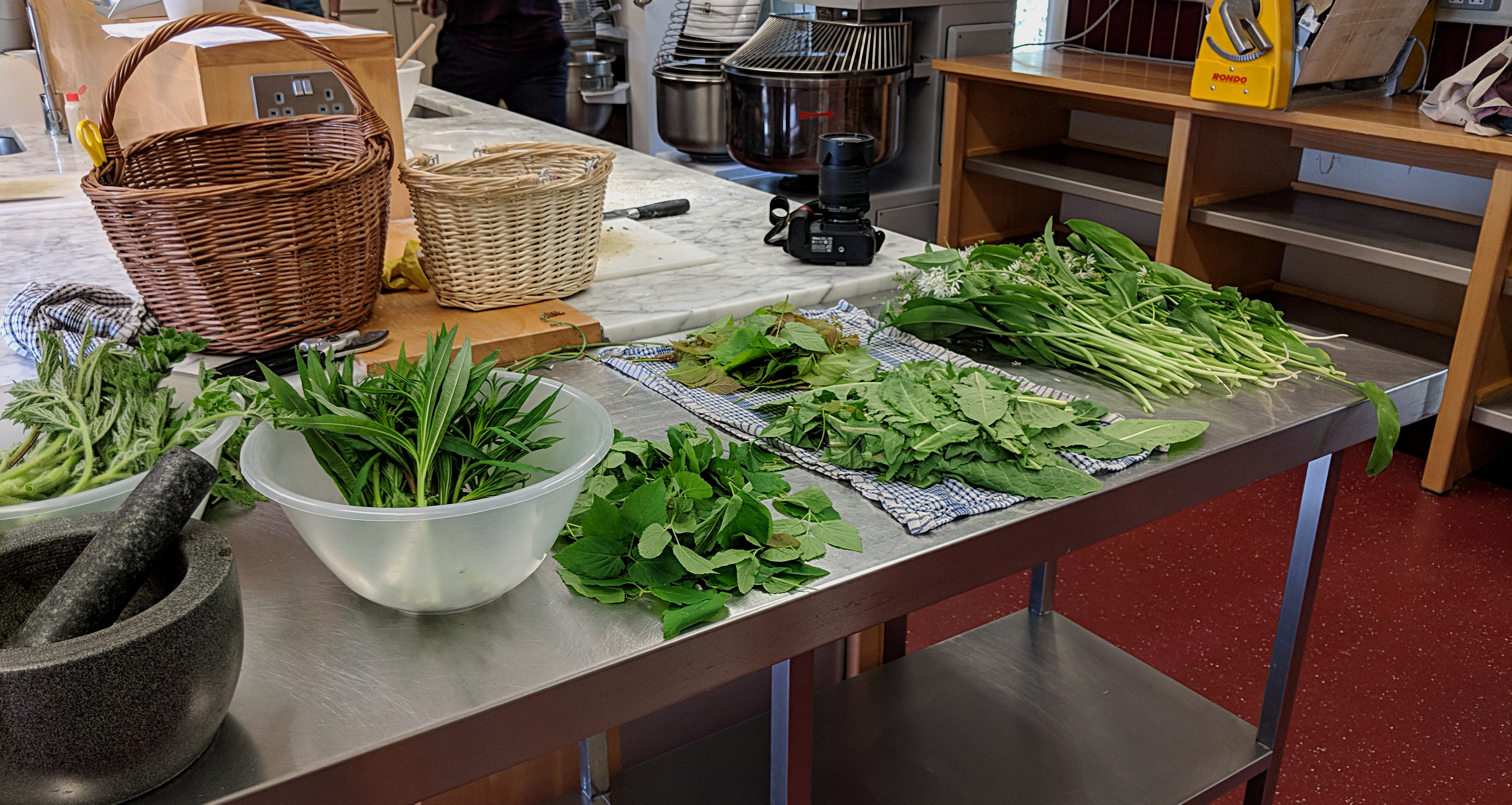 A good three hours of picking passed in a flash and we returned to the school, baskets full of fresh greenery and pretty edible flowers. The second part of the day sees you turn from gatherer to chef to cook a 3 course meal. First on the menu were nettles, tasty and versatile, if a bugger to pick. Nettles are often compared to spinach but I actually prefer the flavour, a little more salty and savoury. In this case we put together a soup with a classic base of potato and onions was that given an injection of green. Very tasty it was too.