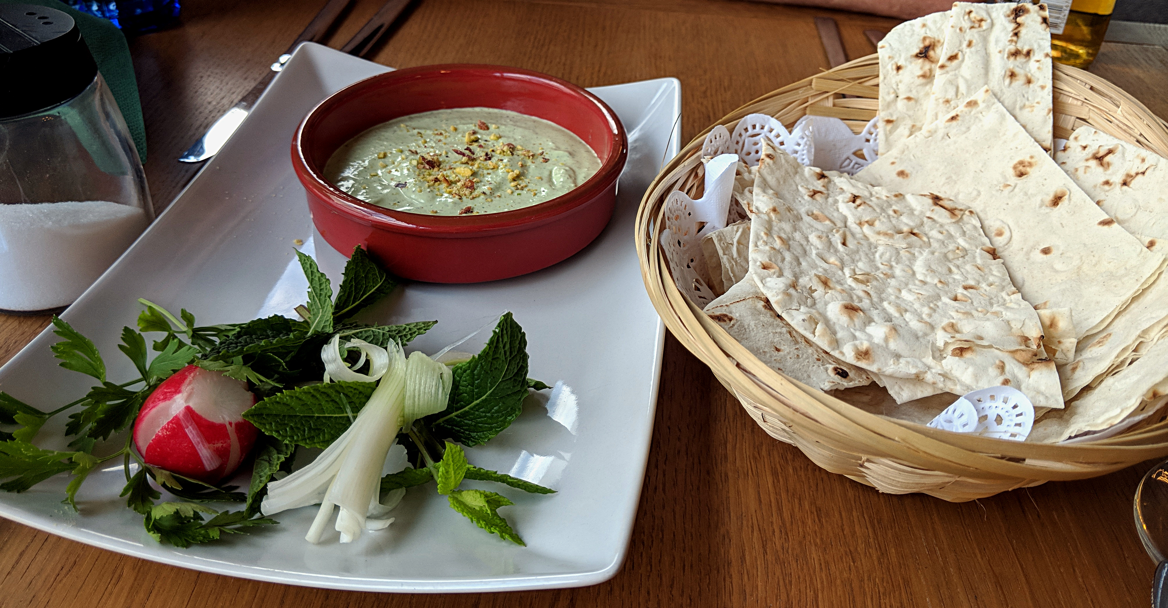 Sneinton Market is often a hive of activity, there are a few little cafes and a regular vegan market is a great spot for produce and food stalls. What it hasn’t had so much of are restaurant that have been successful. Pistachio is looking to change all that with a small contemporary space on Carlton Road serving authentic Persian food. A nice change from the usual dark space with thick rugs and heady incense that can often accompany Middle Eastern cuisine. The menu is pleasingly small, such that they can focus their attentions on only a few dishes…as well as making it easier for me to choose. Interestingly of a handful of starters 3 of them were listed are dips. As we were sharing a large main course we decided to give one a go, Pistachio and Feta seemed appropriate. They cost between £4-5 and are served with a basket of Iranian bread that I believe was Sangak though I could be wrong, it was quite thin and crispy. The dip itself was plentiful enough, chiefly creamy with a subtle citrus backnote which may have been from Sumac, a popular Middle Easten spice that does have a tangy lemon flavour. It was enjoyable, fresh and cooling on a warm day even if the flavours of the feta and pistachio didn’t come through as prominently as expected. Extra bread was delivered without having to request, always a nice touch.