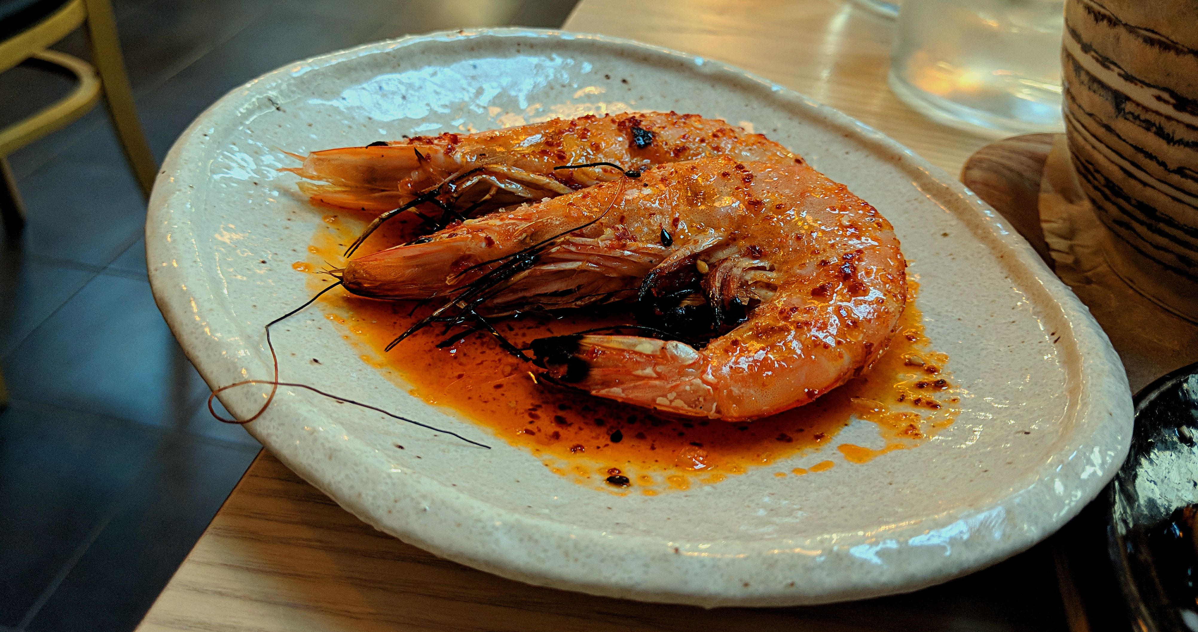 I’m fortunate enough to have visited on a few occasions since it opened. Those who have eaten at their pop ups will find familiar food, and familiar quality. The beef skewers with black garlic mustard remain a star attraction, the umami-rich sauce a great accompaniment to the flavourful meat. A personal favourite are the tofu katsu, the crispy coating enough to convince even the biggest tofusceptic, especially at a very reasonable £3. Salmon tataki was not quite as enjoyable as the tuna equivalent I first enjoyed but the jalapeño ponzu was still a winner. Warmth from the chilli and citrus working well with the rich, clean fish. I was also informed that skewers of mackerel with wasabi were excellent, a favourite of my girlfriend’s. I was a touch disappointed with a previously excellent dessert, Tira’miso’. The dish is still well made, lightness of the cream and sponge still particularly impressive. The miso adding a different dimension whilst staying true to what makes a tiramisu great. To my taste the addition (and amount) of nori powder, a seaweed power used widely at Kushi-Ya, detracted from my overall experience. The best thing I have eaten across all meals were probably some prawns simply cooked in their shell with Szechuan chilli oil. I was more than happy to part with my cash for £2 each from the specials menu. In fact the specials were consistently excellent and captured my imagination more, perhaps the excitement of new dishes compared to having had the majority of the main menu previously.
