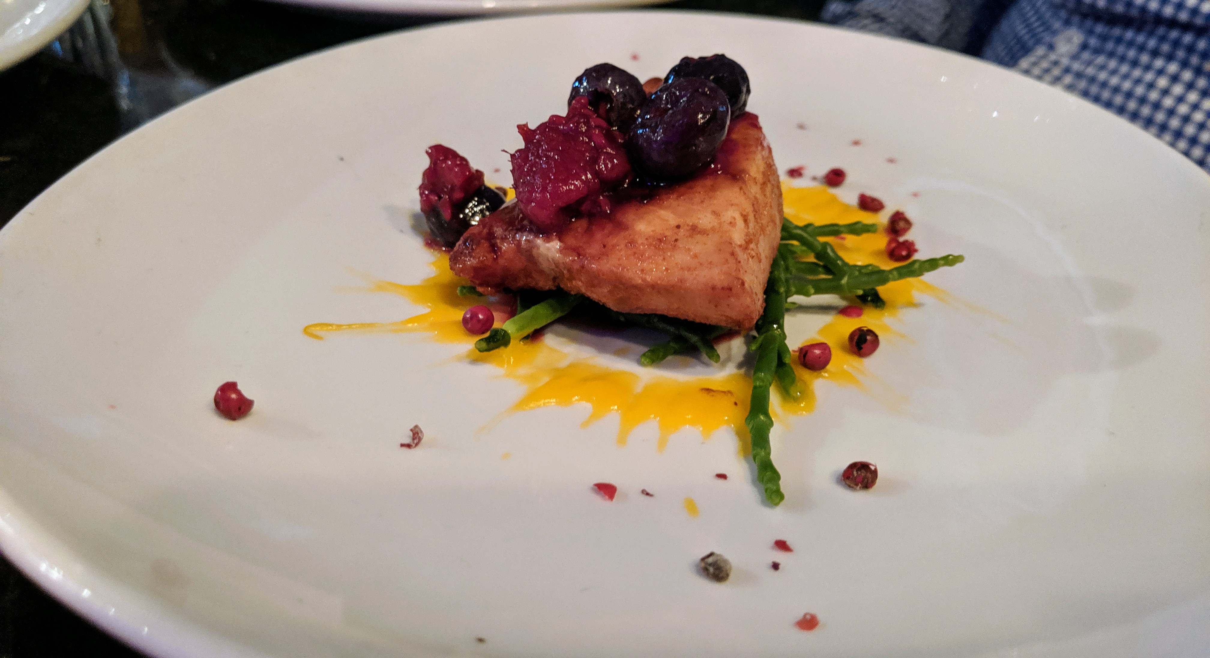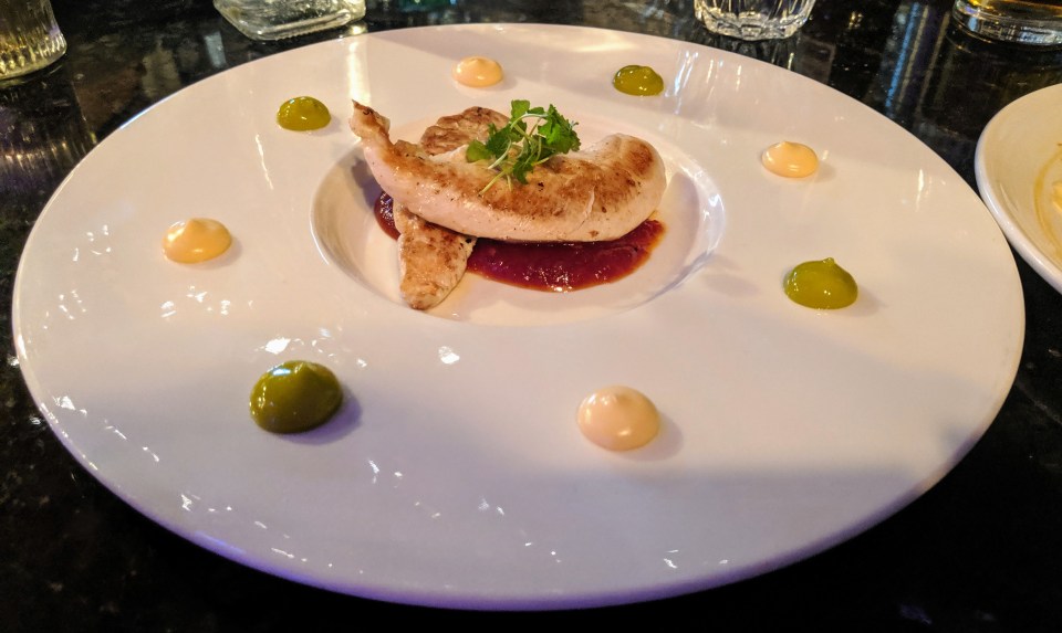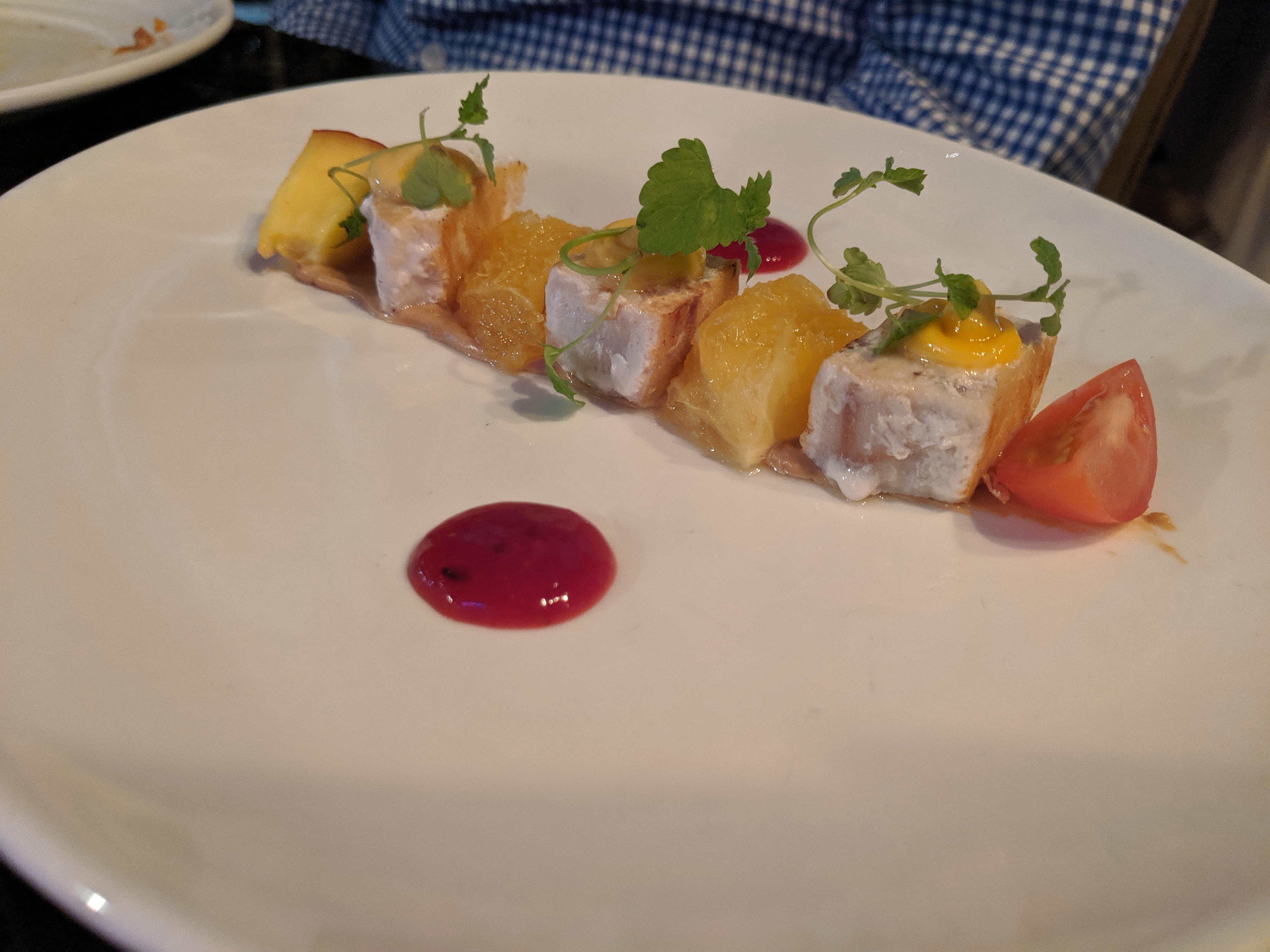 Swordfish, visually, burst off the plate. The fish had been introduced to cajun flavours, nicely balanced and with a handful of fresh samphire. The plate also was dressed with some mango sauce that just about worked, the addition of raspberries and blueberries though was too far, any mouthful was dominated by sweetness and sharpness. Similarly another swordfish dish was served alongside orange segments and a satay sauce. This really didn’t work for me either, sometimes its down to the individual palate of course but my fellow diner had the same opinion on this one.