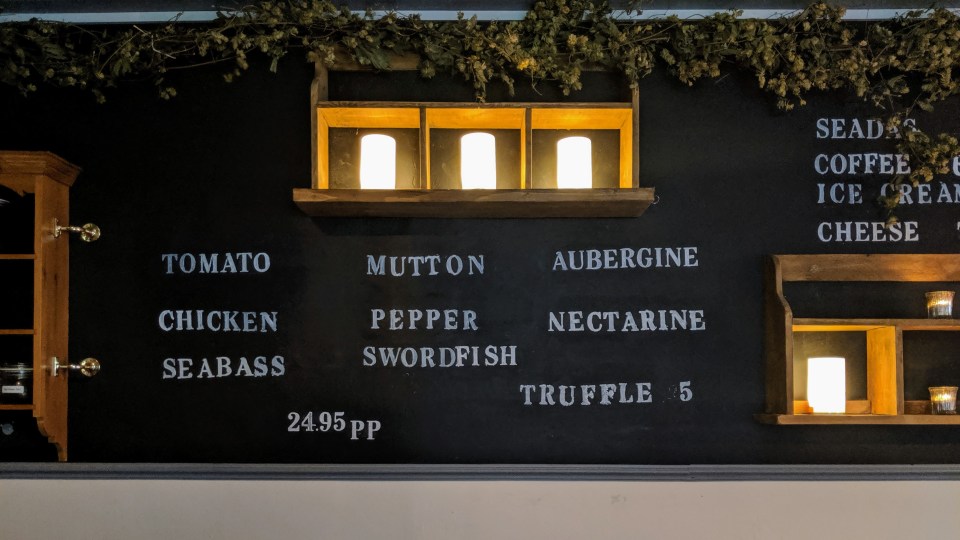 The concept takes a bit of getting your head around, having been I’m still not convinced I’ve got it. There is a blackboard of 8/9 single ingredients which combine in various ways to make up the dishes on offer. There’s quite a lot of debate as to what this really means but it is not at all clear, it also makes for awkward interactions with the waitress. “What would you like?”, “a chicken thing please, maybe a seabass and pepper thing…if that’s a thing?”. You don’t really know what your options are, or at least I didn’t. This format brings with it the model of a fixed price of £25 and the suggestion that you can eat as many dishes as you like. There is a short but well formed drinks list, cocktails of course given the Tilt connection and some decent beer but only a few bottles of wine to choose from.