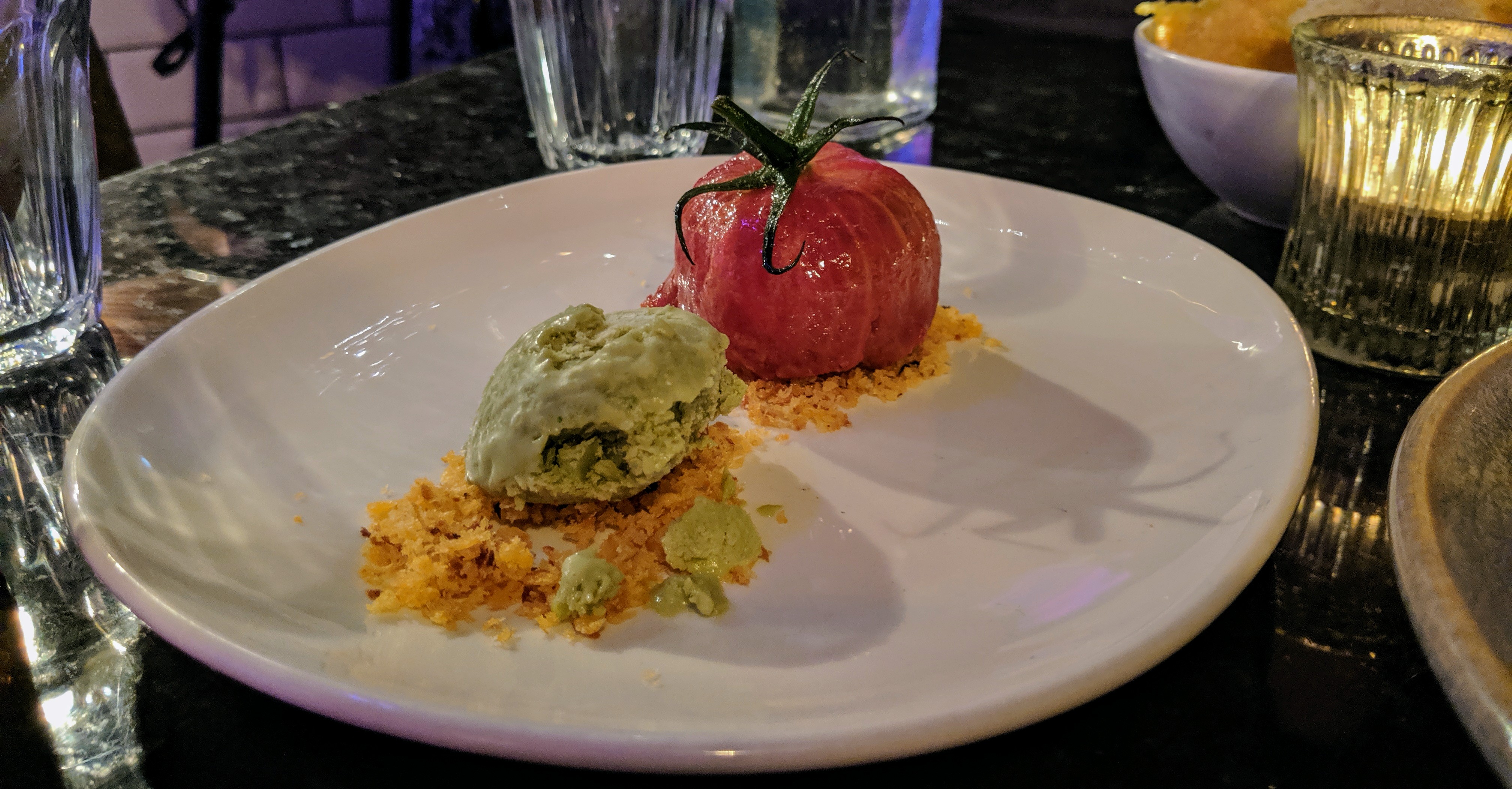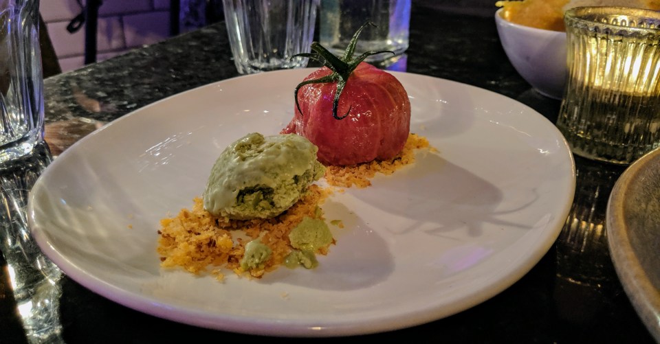 Confusing format aside, how was the food? I enjoyed the bread on the table, a well made focaccia that was liberally oiled and salted. Our first course was mostly some roasted peppers with a few capers and breadcrumbs for a touch of binding, I’d have liked some chunkier bits to provide more texture but a couple of deep fried basil leaves were a nice addition. Simple but enjoyable. The second dish focused on tomato and that element looked fab. It had been skinned and stuff with a tomato ragu but held its form beautifully and glistened invitingly. It would have been excellent were it not for the basil sorbet, I could see before I tackled it that it was not right and with only two elements on the plate there is nowhere to hide. When I managed to chip off some the grainy, rock solid ellipse the flavours worked really well, it is basil and tomato after all.