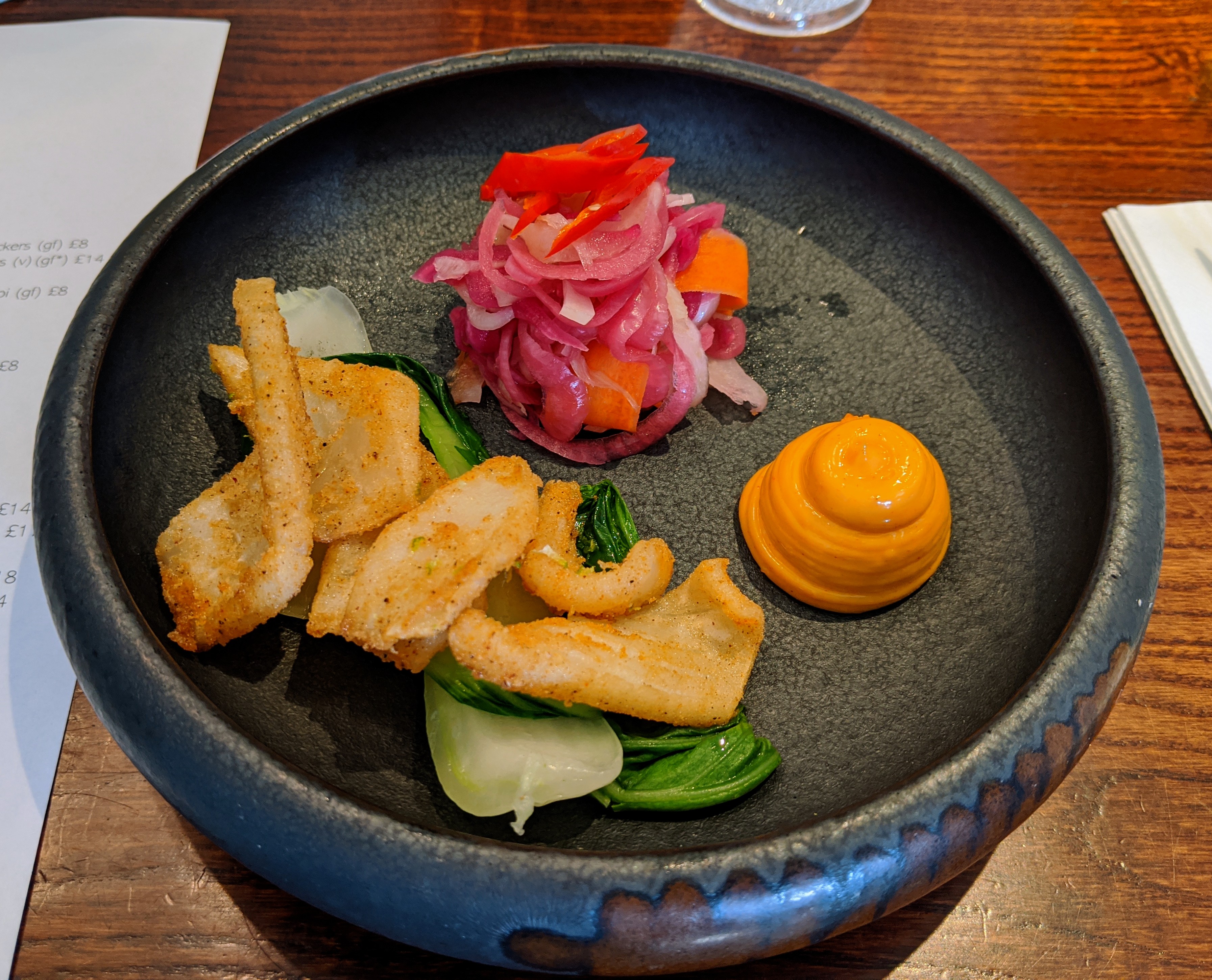 The Railway provides that popular mix of cosy public house with a casual bar/drinking area alongside a couple of slightly smarter spots for dining. I visited recently during Covid so it seemed very spacious but would suspect it would be a little busier usually. For a Saturday lunchtime there was a relatively small menu but plenty to get excited about. They offer a mix of pub classics and more adventurous dishes. I opted for what I would consider to be the latter. Firstly salt and pepper squid with gojuchang (korean chilli paste) mayo and pickled vegetables. It was a seriously pretty bowl, the crockery itself striking with the vibrant colours of the sauce and vegetables jumping off the plate. The most important thing they did get right, the squid being cooked well and remaining really tender when it can so often be rubbery. I would have liked a bigger punch of flavour on both the squid coating and in the mayonnaise, there was a lack of spice coming through but I do like it hotter than most. Pickles provided the biggest kick with their chilli and acidity. The bok choi was perfectly pleasant but didn’t add too much to the overall dish and serving the squid on top felt odd as it made them a touch less crisp.