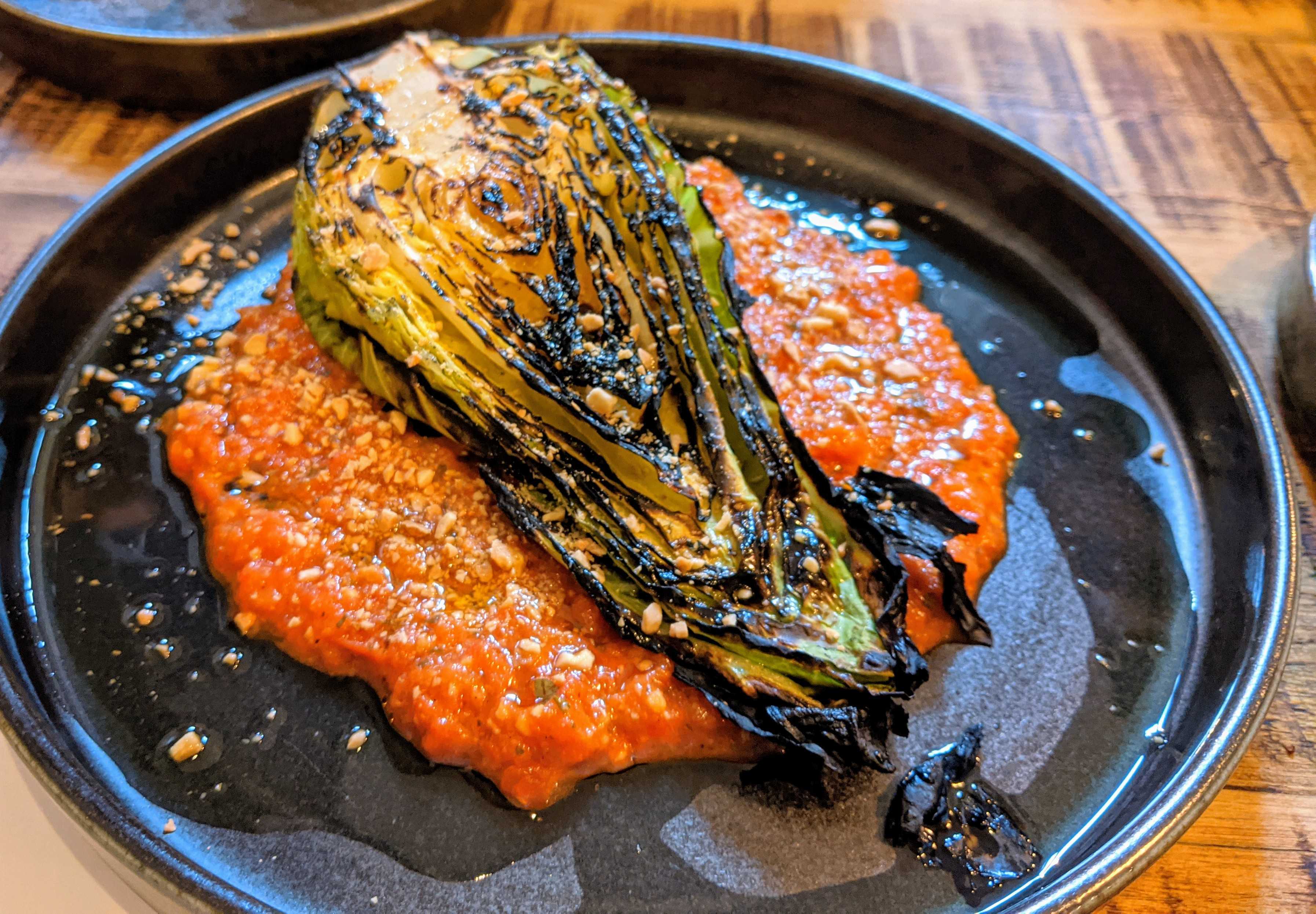 My favourite dish of the evening may be a surprise but sometimes you really can’t beat a bit of cabbage. The grilled hispi’s crispy blackened edges complementing the fresher leaves within. The romesco sauce was also a winner, something I’ve had on occasions that’s been bordering on tasteless. Not here though, the garlicy, tomato kick working really well with the hispi. Lamb flatbread was a serious amount of food, the slow cooked meat had a subtle spicing but there needed to be more pickles, more than the small side pot of yogurt to really bring this to life. As it was there was little to fault but it was less special than the other dishes and much more reminiscent to something I’ve cooked at home . There was a singular dessert of yuzu white miso cheesecake which had enough intrigue about it for us to fit it in. It was served in a ramekin which lost a bit of that layer effect that you usually get with a cheesecake. The overriding flavour was yuzu and I could detect very little miso which was a shame. Perfectly pleasant to finish but quickly forgettable.