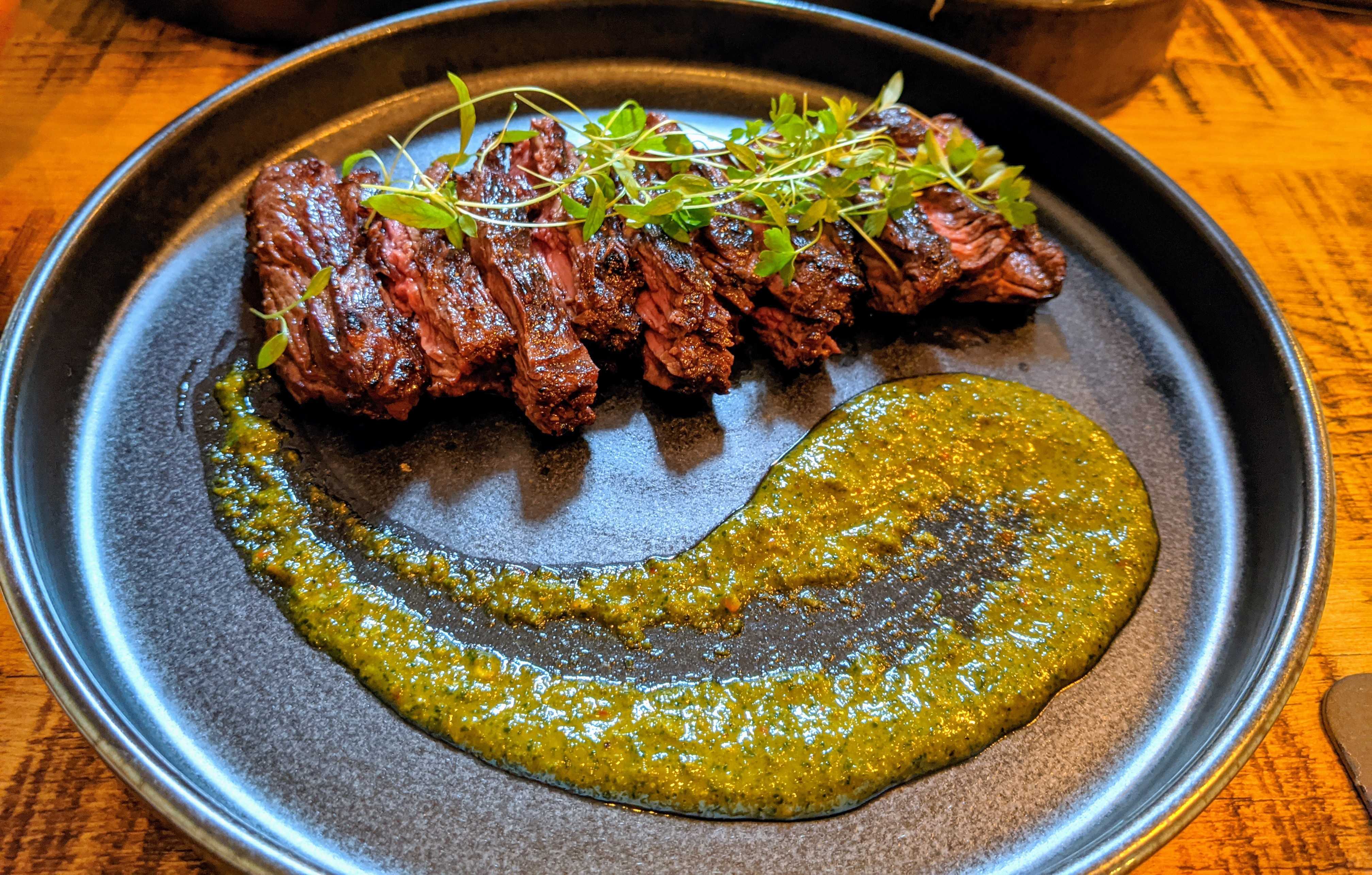 A whipped feta salad was amongst the first to appear, a summer stormer with flavourful heritage tomatoes, zingy dressing and herbs bought together by the rich cheese. Another side of fries with Lincolnshire poacher are always likely to be a crowd pleaser, I’d have liked a touch more colour on the chips but they were still crispy and it was good to see a more interesting cheese being employed than usual. The first of the main dishes I tried was the bavette steak and I noted the plating had changed from having seen it on Instagram. Not convinced the smear suited the dish but presentation aside the steak was really well cooked to my taste, medium rare with smoky char from the cooking adding to the natural flavour of the meat. The chimichurri bought a lovely tang of vinegar, freshness of herbs and warm from a subtle heat.
