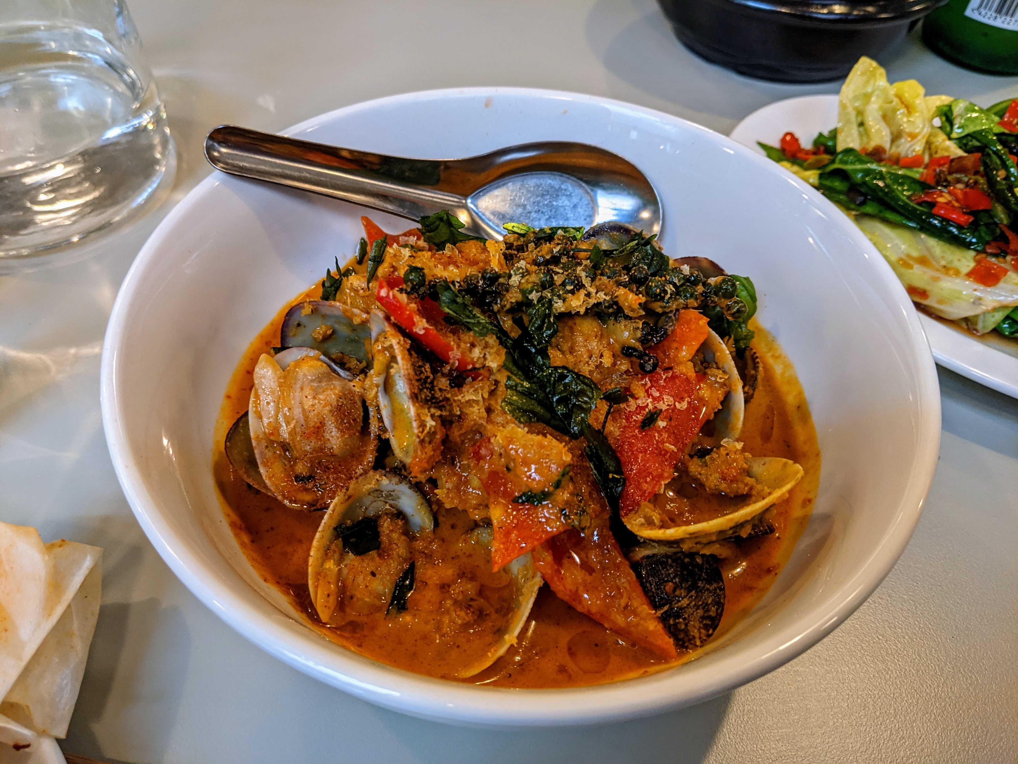 We had been building up to two of the larger dishes. It was a crescendo both standing out from what went before despite an already good meal. My dish of the evening was “Sausage and Clams” (£12). The Thai red curry sauce was the best I’ve ever had with the natural juices from the clams, fragrance from the Thai basil, depth from the ground sausage and a great underlying heat. The sweet Dorset calms were the icing on the cake, the sort of seafood I love but we see little of around here. My love letter aside the most popular all round dish was the Claypot Rice (£14). The star, you think, is the pork belly as you lift the lid and spot your reflection in the prefect glistening glaze. And it is stunning. Soft, sweet, salty and fatty all in harmonious measures. Its served alongside a couple of accompaniments I ashamed to not have the full details for, some minced spring onions and choi sum do bring a welcome lightness and freshness to the rich meat. But what you soon discover is this could be the best rice you’ve ever eaten. The beauty of the clay pot is that the rice has started developing a crust and the combination of the chewy, crunchy grains with the flavours seeping into them is really a memorable experience.