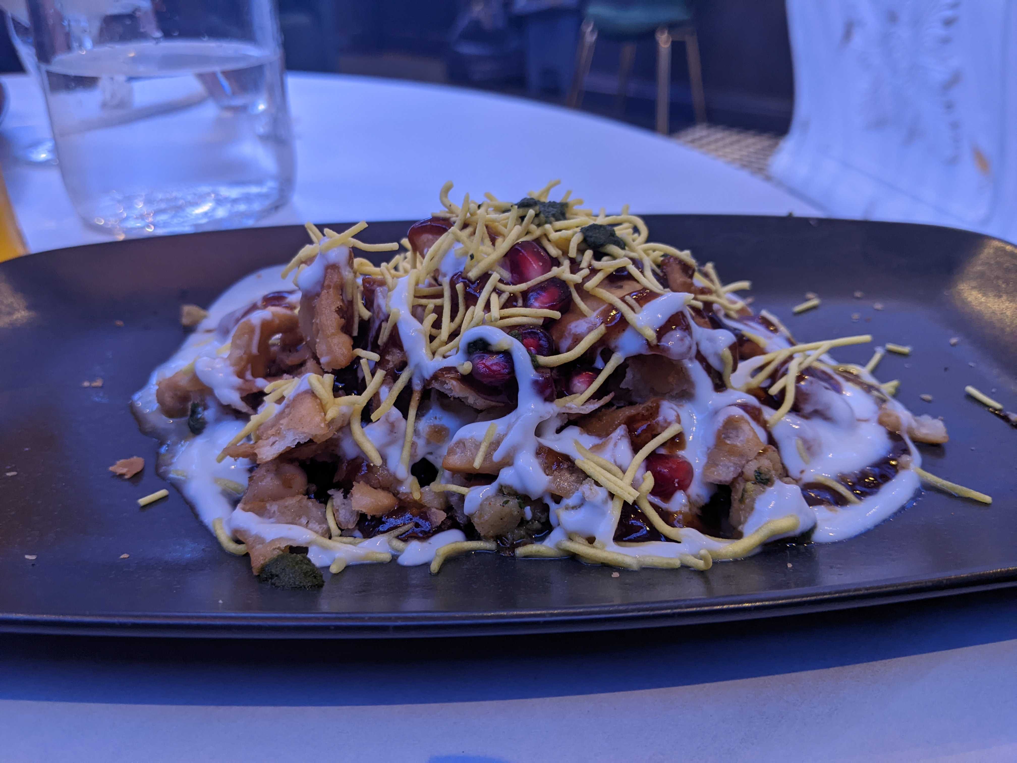 We had given them a call earlier in the day to book at a table at 1930 but were assured “just come along and you’ll get in no problem”. What transpired was 15 mins mostly standing in a cold doorway. I’d rather they were honest, benefit of the doubt for now though. We were seated at a booth and perused the (very colourful) menu. Anyone who had heard anything about Tipu Sultan should know there is no alcohol, lassi’s all round. The food options were familiar to those who have eaten at “authentic” Indian restaurants and I like the fact they did eschew some of the more common staples of Korma, Madras etc. I went for a lighter starter of chaat followed by my favourite curry of achari chicken which I’d been pleased to see make an appearance.