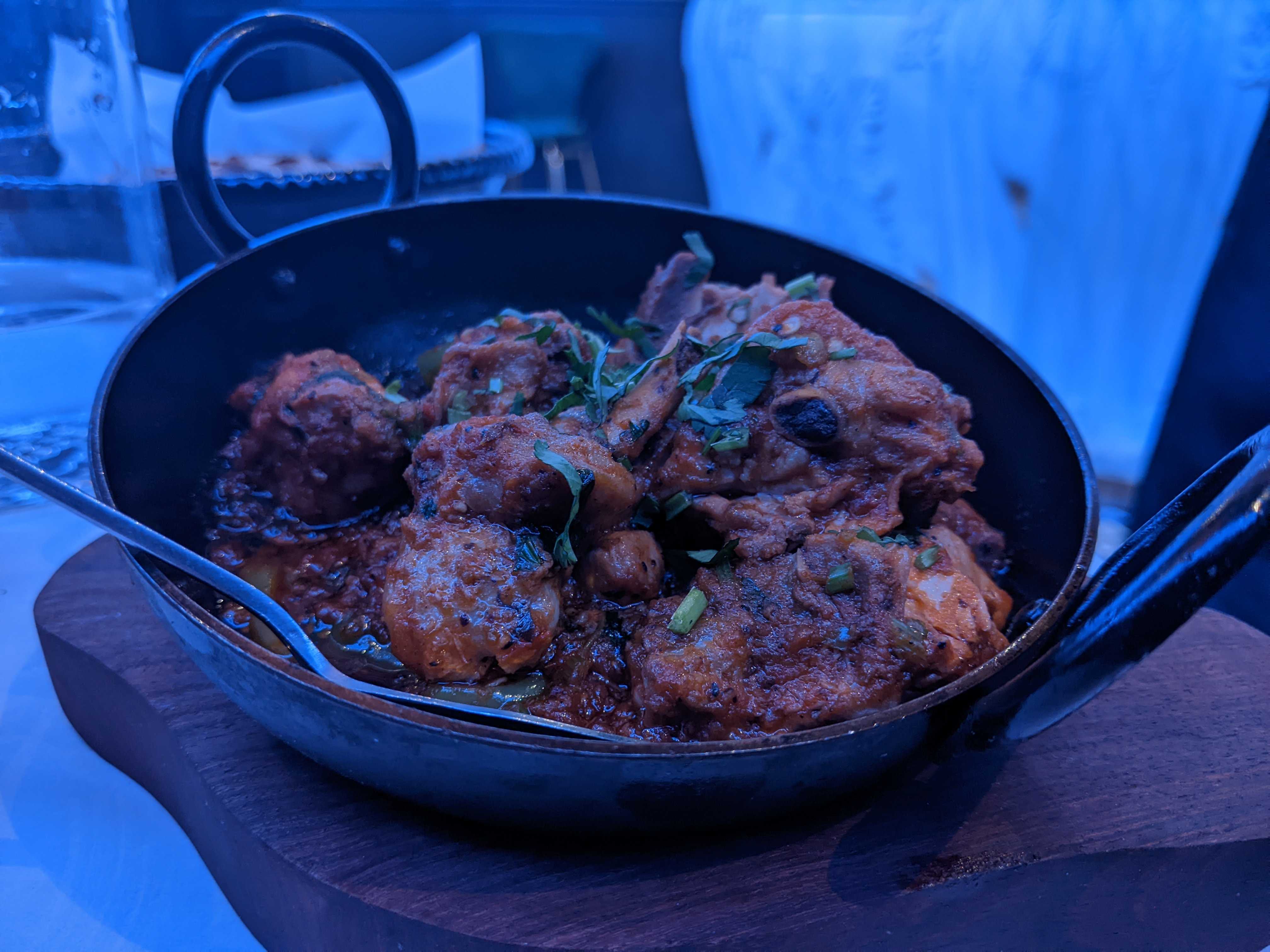My papri chaat (a very reasonable £4.95) arrived stylishly presented. You can’t go too wrong with a chaat, it was crisp with tart flavour from the tamarind, body from the chickpeas and additional pops of flavour from the pomegranate. The yoghurt was quite thin and would have been improved by a higher quality as well as some more flavour from the chickpeas which were quite plain. Not as good as a Rickshaw’s version from further up Mansfield road. Being an achari lover (note: not claiming to be an expert) I was struck by a couple of immediate disappointments as it hit the table. An achari uses pickles and pickling spices/vinegars to give flavour to the sauce of the dish. On appearance this incarnation was quite dry and also particularly oily. The chicken was also on the bone, not something that bothers me but I think for many diners they would want it to be mentioned on the menu. Back to my fears which were sadly founded, although there were pockets of pickled peppers the underlying flavour wasn’t there. The chicken itself was quite dry too and there really was a lot of bone to pick through. At £10.95 it was £3 more than a much better version at Desi in Hockley albeit still cheaper than mains in most of the city’s best and Masala Junction in Carrington. I will say friends had an overall better experience and the best dish was karahi gohst with tender lamb and real depth of flavour from its sauce, though nothing impressed us too much.