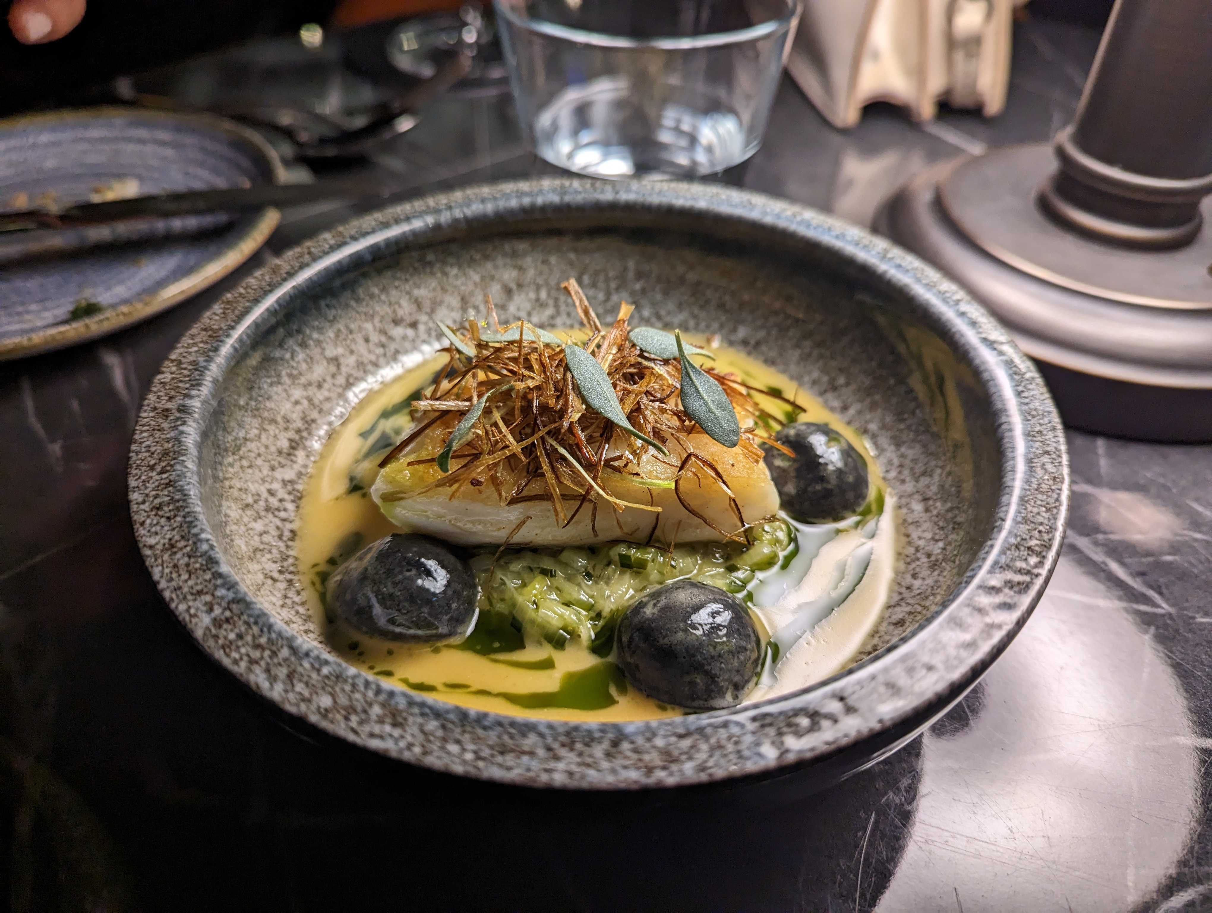 Onto the larger plates and things were broadly more successful here. Salsify over coals (£10) with brown butter hollandaise, chilli jam and poached egg was an enjoyable incarnation of an ingredient you don’t see too often, brownie points for that. There was nice embellishment with crisp pops from puffed buckwheat that brought a different texture to the dish. The brown butter and chilli flavours were not quite in harmony though, combining to make almost a BBQ flavour where I’d have preferred a more traditional hollandaise. The dish of the evening was probably halibut (£11), both in flavour and appearance. Squid ink gnocchi was visually striking and a clever way to introduce some carbs to proceedings, a ponzu (citrus flavour) beurre blanc was excellent having a luxurious creamy flavour that was lifted by the citrus. I had my eye on venison loin but for some reason it was off and replaced by a chicken kiev (£13). Chicken was moist and crispy, punchy parsley butter combining nicely with potato mousse and celeriac. Black garlic and siracha were also mentioned which I was actually happy not to pick up on as there was already enough happening without the potential confusion both of those strong flavours could bring. A criticism of menu design rather than execution was that all 3 of these plates had a fairly similar rich/buttery sauce. Hollandaise, beurre blanc and kiev butter with potato mousse. Whilst all agreeable in each dish it felt a bit too rich and like hard work by the end. It is winter though I suppose.