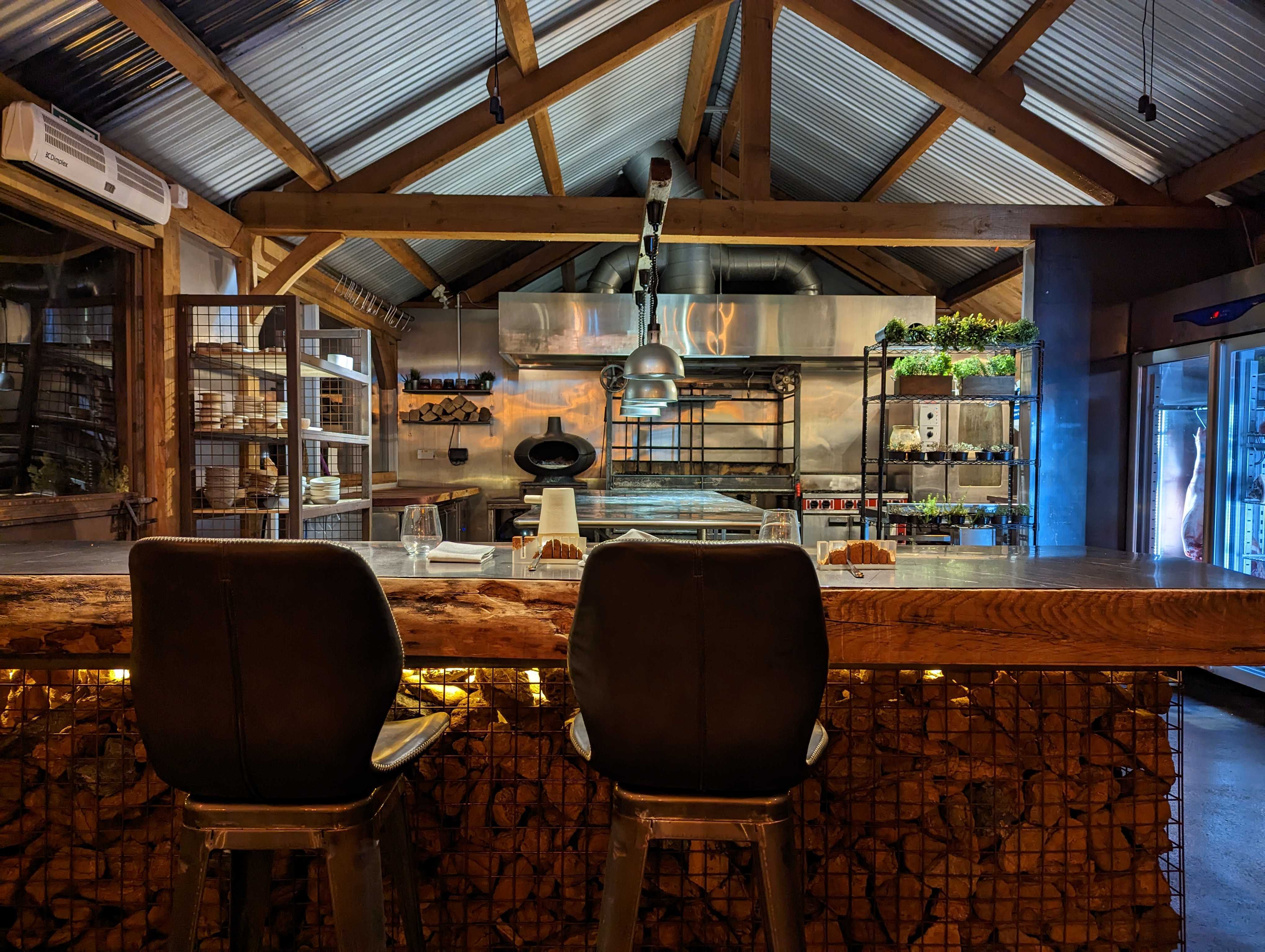 As we were relocated for the main part of our meal the surroundings moved up a notch to a beautiful dining room. Rustic beams and modern metals combined with some leafy additions to make a stylish and spacious experience. The attention to detail extends throughout, impressive given how new the restaurant is and the general atmosphere with contemporary music was excellent. We were first furnished with a delicious, salty and warming broth which was exactly what was required on a cold January night. The bread and butter from the adjacent dairy farm was of equally high quality and provenance.