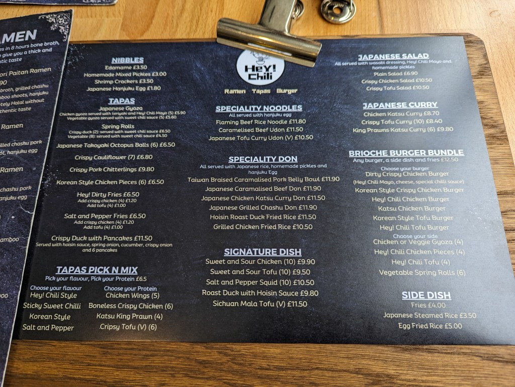 U-Canteen may have gone but out with the hyphen and in with the exclamation as Hey! Chili takes its place in a sliver of space on Heathcoat Street. The team behind this venture are new to Nottingham but already have a site in Loughborough which has been around since 2021. The restaurant is very basic inside with a couple of neon flashes from motivational quotes that make me roll my eyes. It’s the sort of place I can only imagine going for a quick lunch with a friend. The spartan interior and no frills experience don’t put me in mind of a cosy date night location. It’s pretty hard to nail down where they specialise, perhaps global fusion is as close as you can get with “Tapas” and burgers on the menu alongside traditional Japanese dishes as well as other Asian influences.