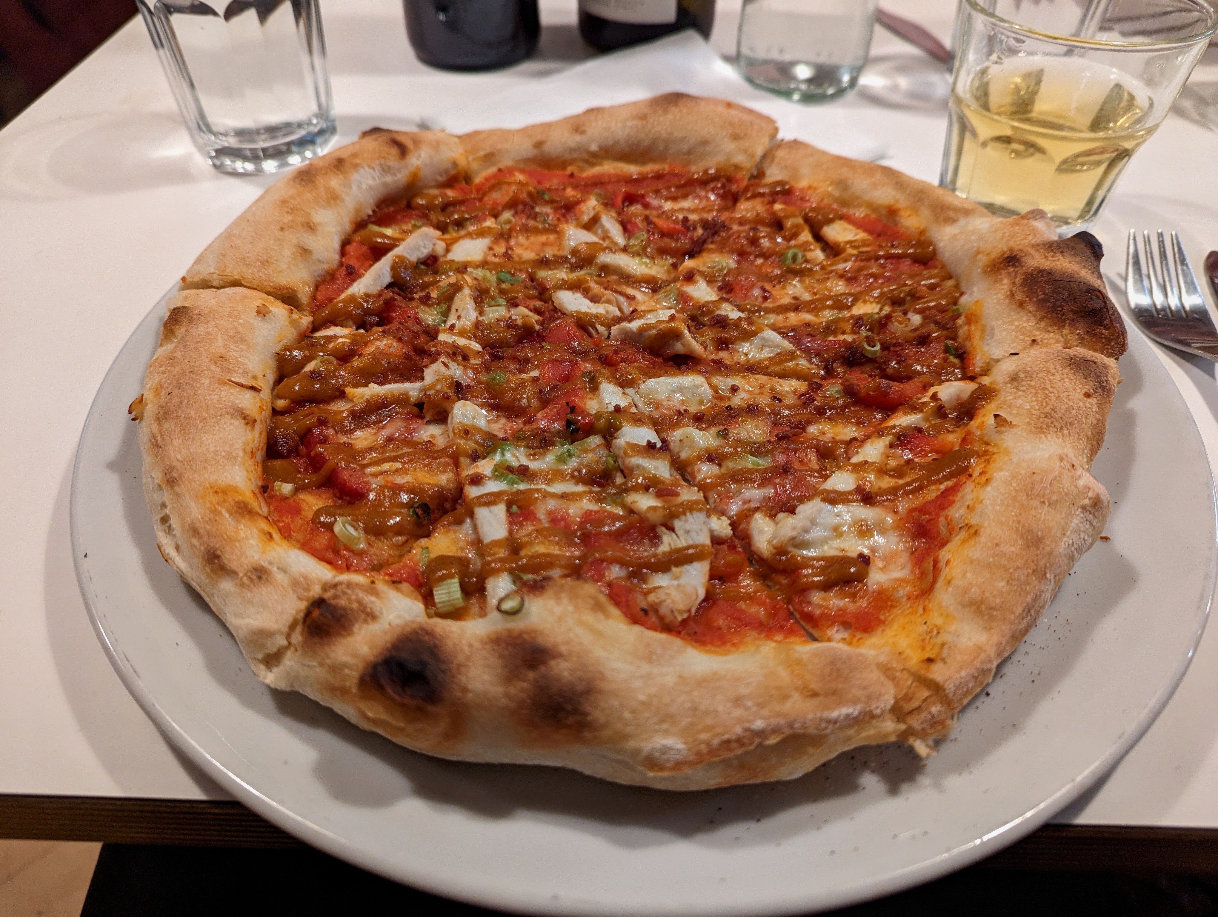 Their menu is equally appealing, it’s size mirroring the surroundings by being compact and uncomplicated. 8 pizzas at between £9-14 and 2 sides at £7. At this scale my chicken and roasted red pepper number arrived in good time, I’d gone for a BBQ pizza which is a bit of a guilty pleasure and something you rarely see at a ‘serious’ pizza restaurant. I enjoyed their take it on with a traditional tomato base but a drizzle of deeply flavoured sauce across the top, the best of both worlds. The toppings were generous and all complimentary, I particularly enjoyed the quality and sweetness of the red pepper. The base was a little different to any other of Nottingham’s pizza offering, puffy and bubbled but particularly crispy, not my favourite style but I could appreciate the quality. A side of sweet potato with a soy and ginger glaze and sriracha mayo surpassed my expectations. Meltingly soft and packing a real punch from the Asian flavours.