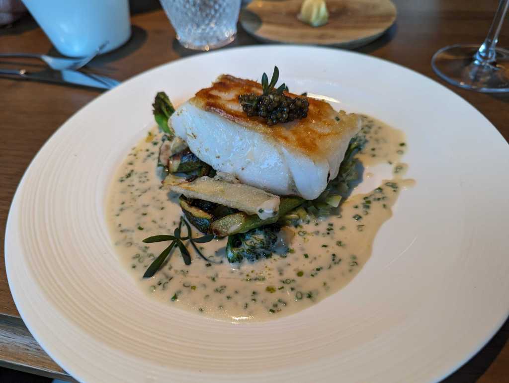 What will please many is the traditional menu, despite the fine dining there’s no tasting menu here! A la carte, 4 or 5 choices per course. On my visit last year they also had some posh snacks available, caviar and oysters but they seem to have disappeared from the menu. They offer set menus including lunch at £50 and a ‘Supper Menu’ of 3 courses for £45 although I struggled to find exactly when that was available. From their evening main menu I had to choose Beef Tartare (£20), which is a favourite of mine. The disc of meat was prettily adorned with some pickled vegetables, confit egg, black garlic puree and some sourdough crostini. It was a pretty and vibrant arrangement that also worked well on the palate. The tartare itself was well seasoned, usually the most important thing, but the additional elements contributed pops of richness or acidity that were welcome. My only real criticism was more of the crunchy sourdough was needed to balance textures as well as flavours.