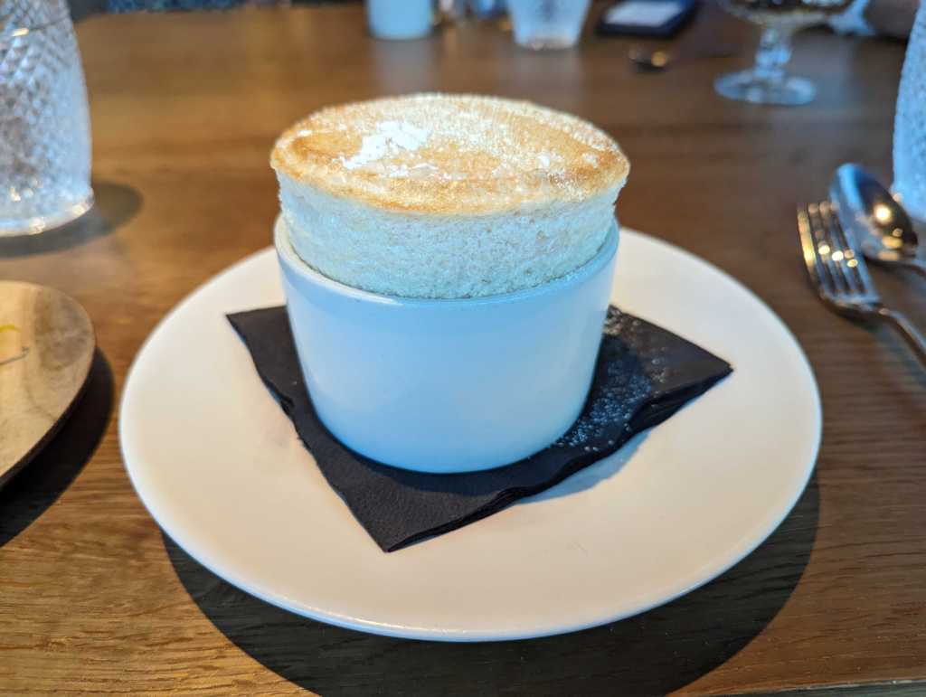 Main course was Cod with a cream sauce, vegetables and sea herbs (£34). Fundamentally a fantastic piece of fish which was well cooked, crispness on top with large pearly flakes beneath. The vegetables were marginally more interesting than they looked with some battered courgette alongside broccoli and the herbs did lift things with a salty and fragrant tang. The sauce was good, nice acidity from wine running though it, classic and unexciting but well made. The dessert I get most excited to see on a menu is soufflé. There’s something so special about the fragility, hard to perfect the rise and injection of just the right amount of flavour. Unfortunately there isn’t an example on their current menu, unfortunate both because they executed my blood orange example very well. But also because I couldn’t find out how much they charge, their other desserts are £14-16 so in that ball park.