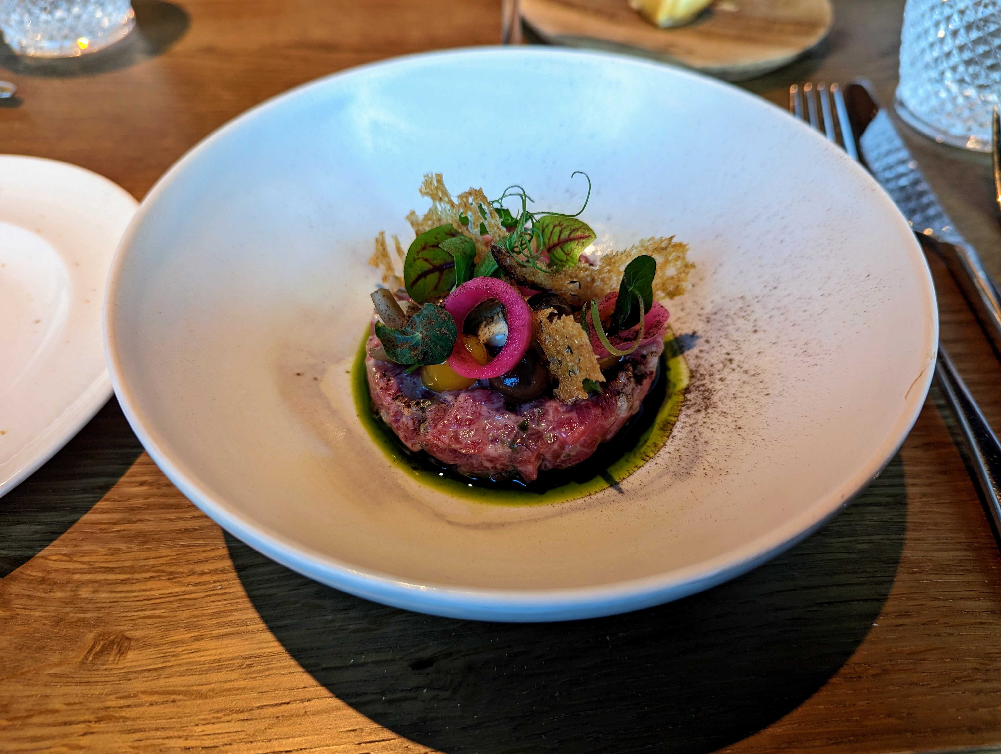 What will please many is the traditional menu, despite the fine dining there’s no tasting menu here! A la carte, 4 or 5 choices per course. On my visit last year they also had some posh snacks available, caviar and oysters but they seem to have disappeared from the menu. They offer set menus including lunch at £50 and a ‘Supper Menu’ of 3 courses for £45 although I struggled to find exactly when that was available. From their evening main menu I had to choose Beef Tartare (£20), which is a favourite of mine. The disc of meat was prettily adorned with some pickled vegetables, confit egg, black garlic puree and some sourdough crostini. It was a pretty and vibrant arrangement that also worked well on the palate. The tartare itself was well seasoned, usually the most important thing, but the additional elements contributed pops of richness or acidity that were welcome. My only real criticism was more of the crunchy sourdough was needed to balance textures as well as flavours.
